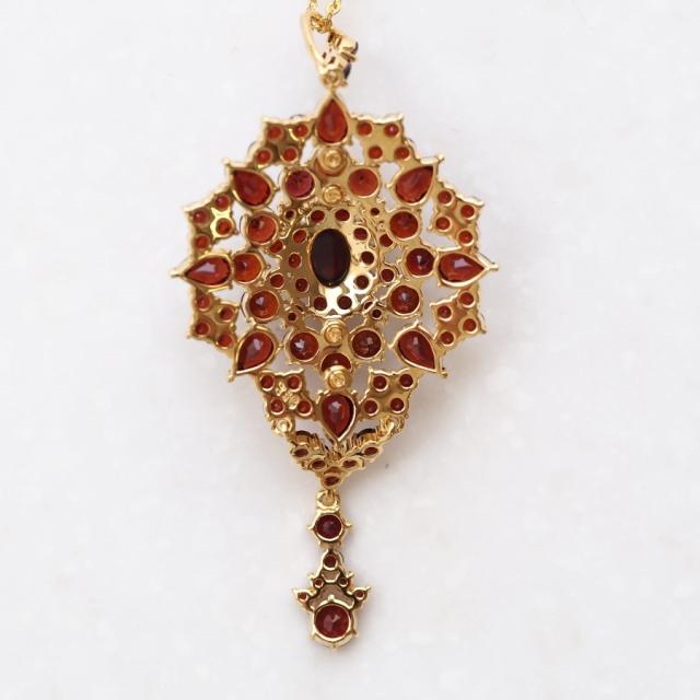 裏から見るとかしめを多用した3重の構造になっていてガーネット同士がステップ状に重なりあう素晴らしいペンダントです。
