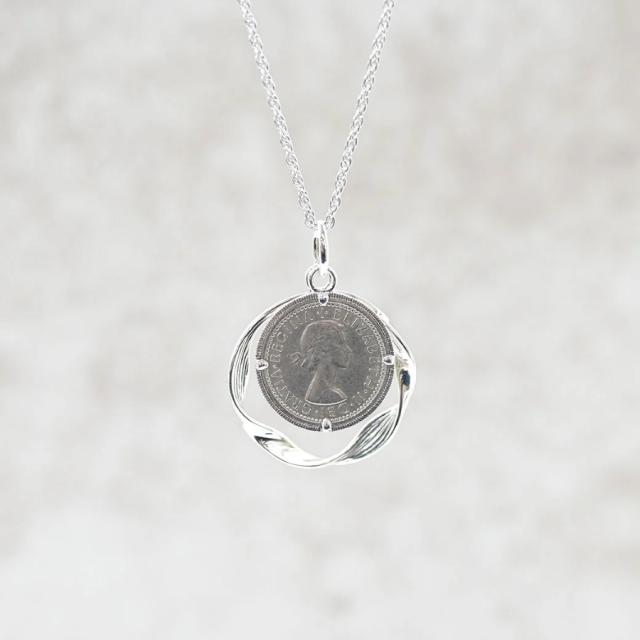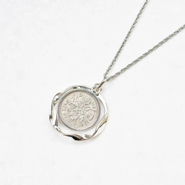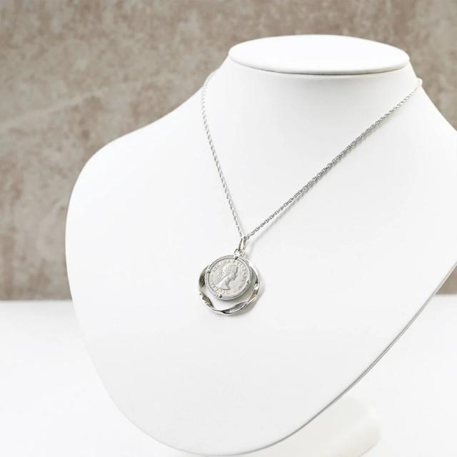 イギリスの6ペンスコインが素敵なペンダントは、揺れ感のあるデザインでコインをリバーシブルに楽しめるのが特徴です。コインの表にはエリザベス女王の肖像が、裏にはイギリスの象徴的な植物が描かれています。