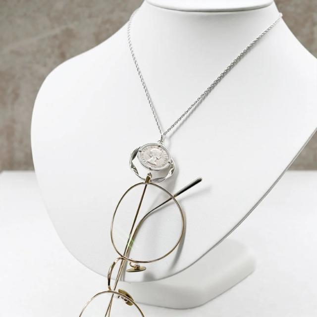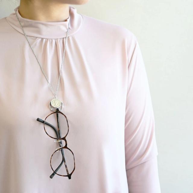 ペンダントの輪の部分は、メガネホルダーとしても使える実用的なデザインが。外出先で眼鏡を簡単に掛けておくことができ、便利さも兼ね備えています。