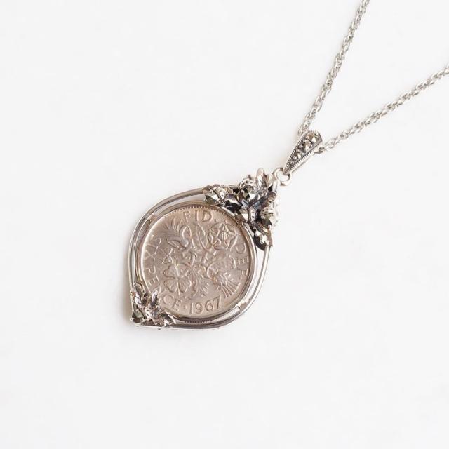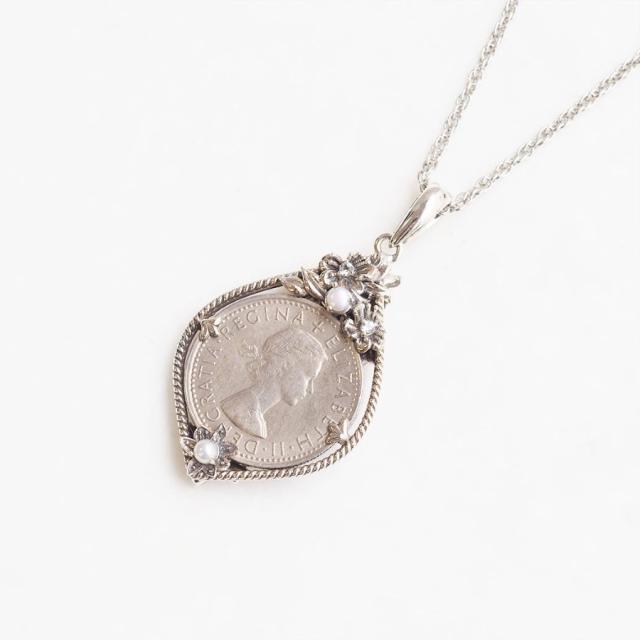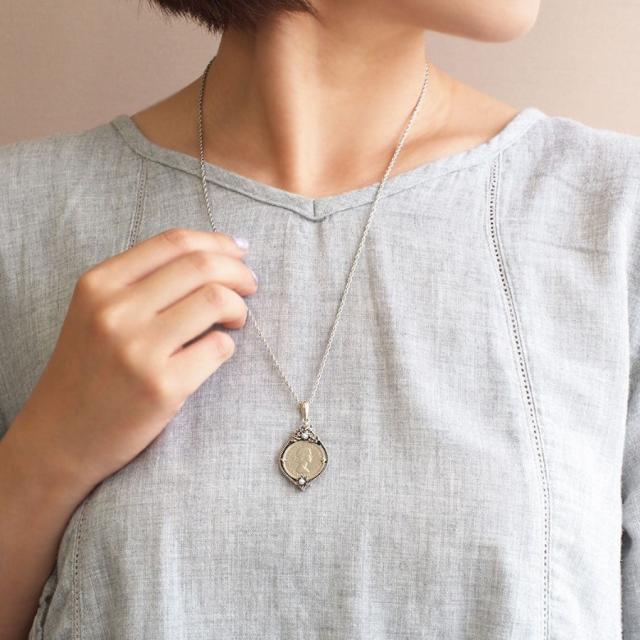 幸せを呼ぶ6ペンスコインの表には、イギリス王室に受け継がれるマートルをモチーフに、裏は幸運の実エイコーン(どんぐり)をあしらった2wayタイプのペンダントトップに仕上げました。そしてイギリスやアイルランドなどでは6ペンスコインは身につけていると生涯お金に困らない、金運が高まるラッキーアイテム。