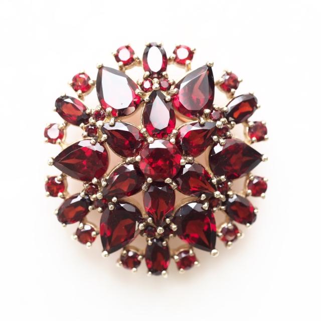 フラワーモチーフにガーネットをあわせたエレガントなブローチ。