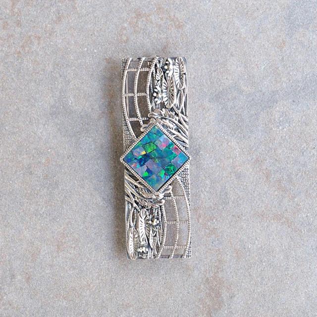 モザイクオパールの多彩な色彩がモネの睡蓮の色合いにとてもマッチしており、その上下に地金部分でデザインされた睡蓮の葉や、花の部分に留められたマルカジットがよりモザイクオパールを引き立ててくれています。