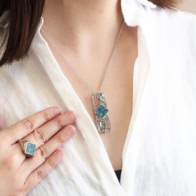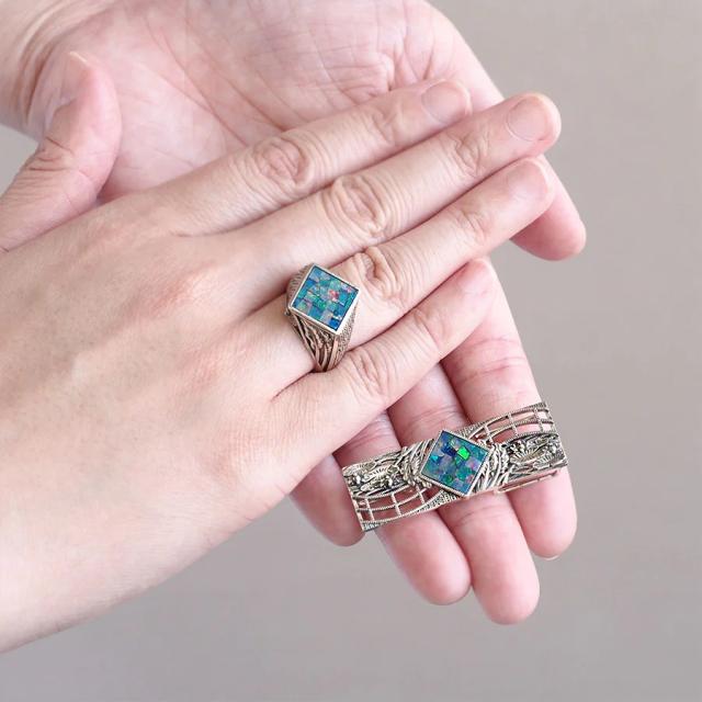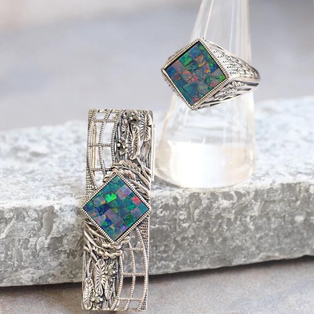 天然オパールをモザイク柄に貼り合わせてつくられたモザイクオパールを使用しました。