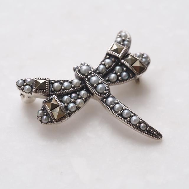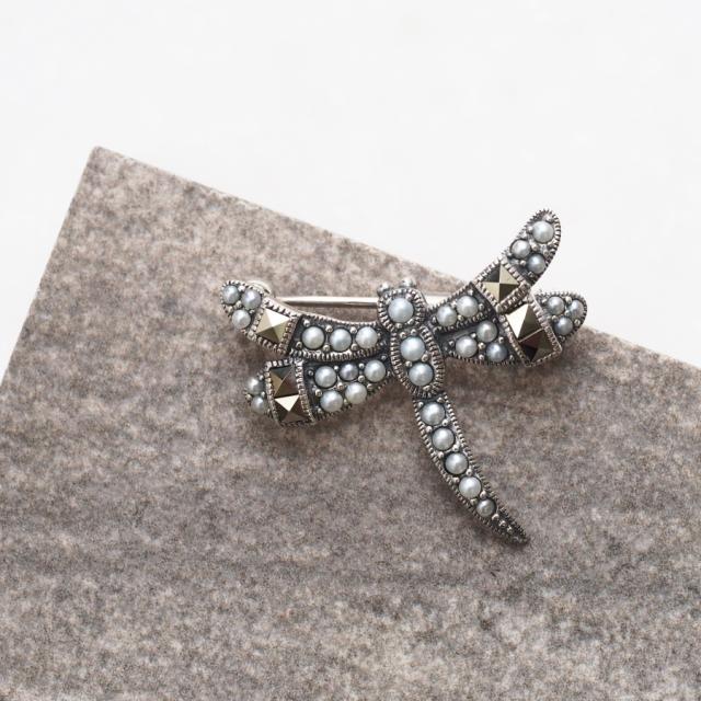 秋の夕暮れに羽ばたくトンボをシードパールたっぷりのブローチにしました。
