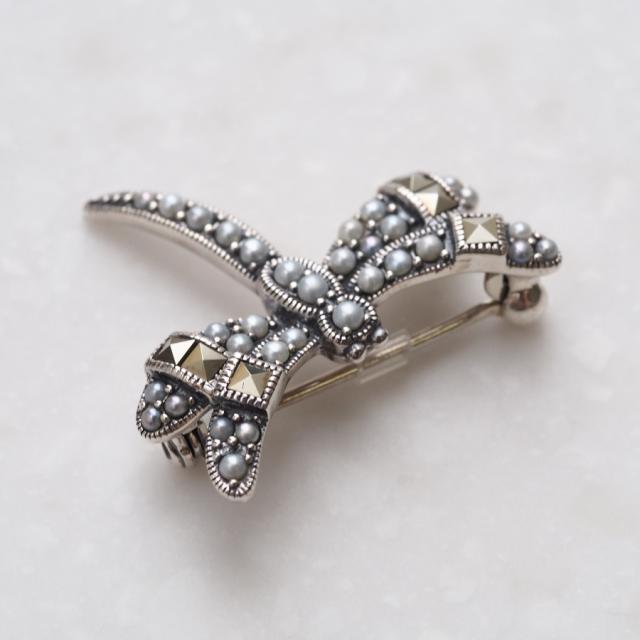 羽にはピラミッドカットのマーカサイトが優雅にきらめいています。