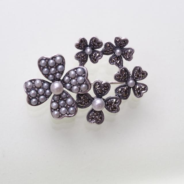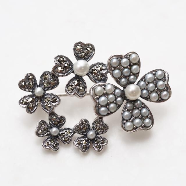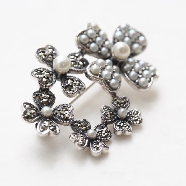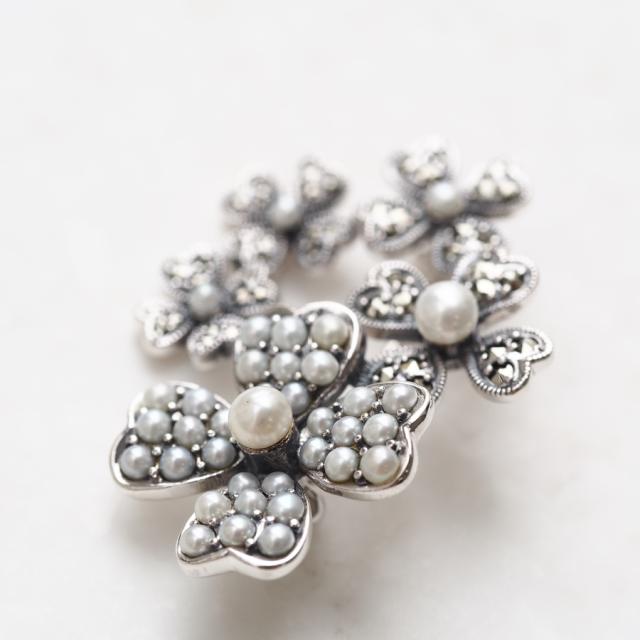 一番大きな花びらはシードパール、小さな花びらにはマーカサイトが留まり、異なる花びらの表情をお楽しみいただけます。