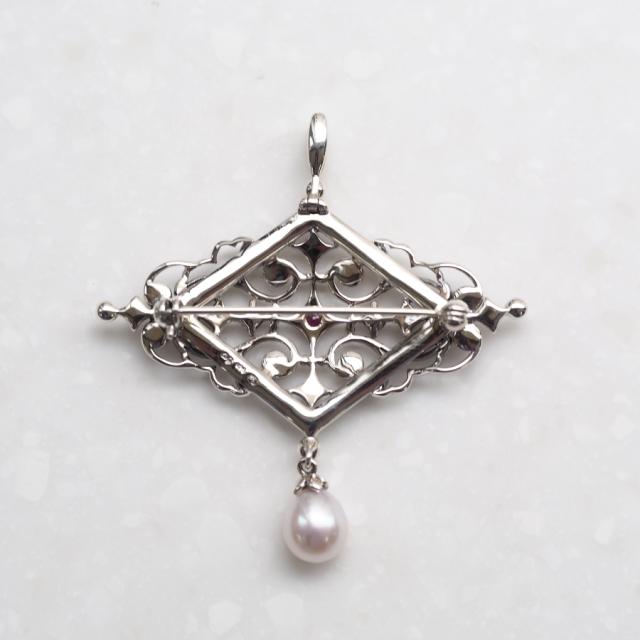 中心のルビーとぶら下がるパールがポイントです。