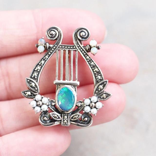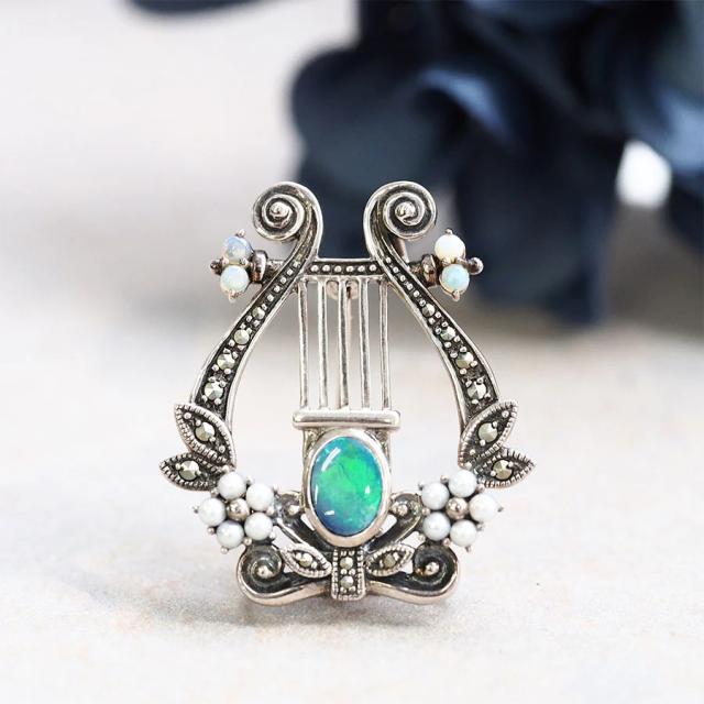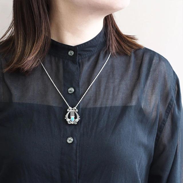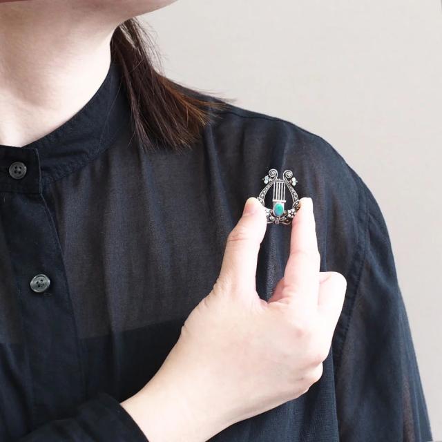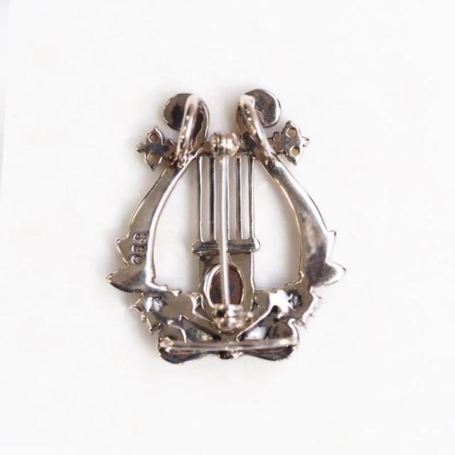 旧約聖書でダビテ王が悪霊退治に使った際音楽の女神が持っている竪琴をイメージし、エレガントでかわいらしいペンダントブローチです。