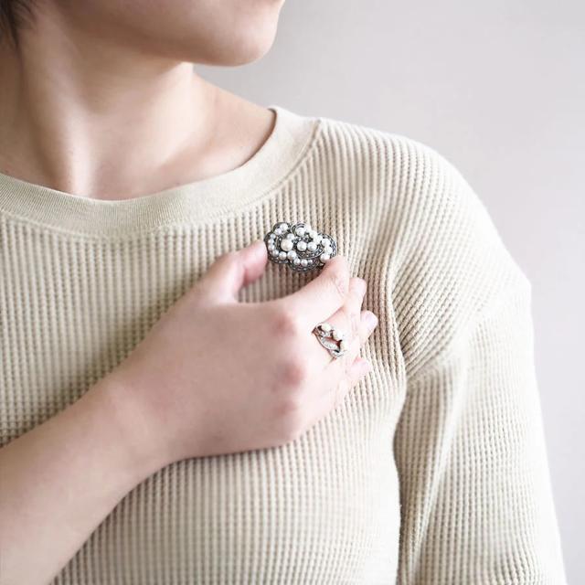 綿雲のようなシルバーの枠に、大小さまざまなサイズのパールをバランスよく留めました。