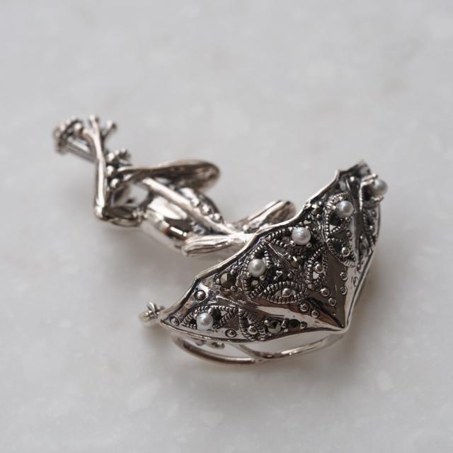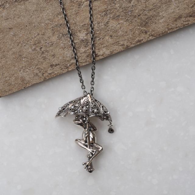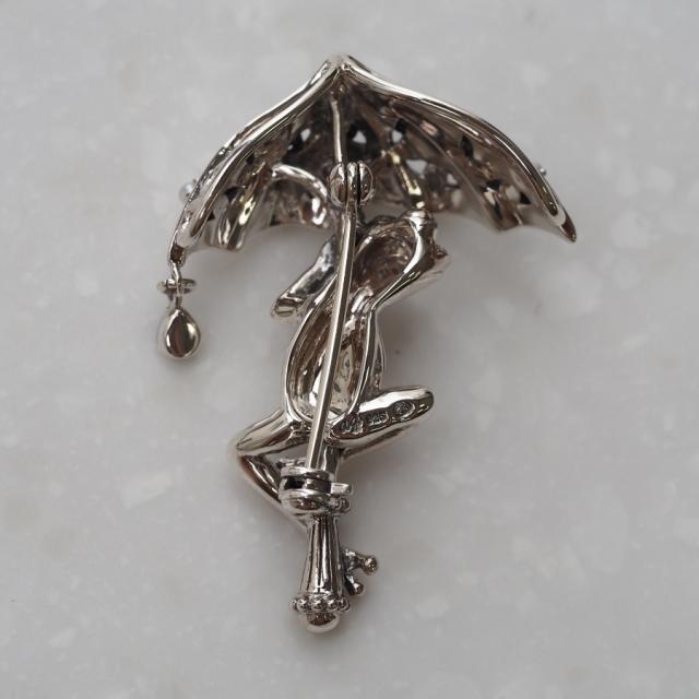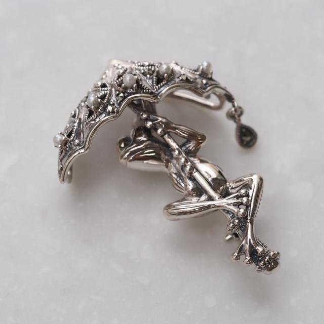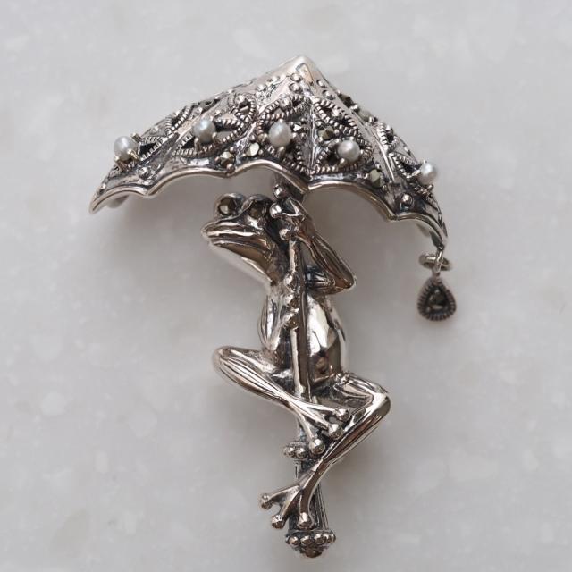 傘をさして雨空を覗き込むカエルがとてもかわいらしく、全体的にリアルかつ立体的な仕上がりとなっています。傘の部分は繊細なオープンワークにシードパール、マーカサイトが留められ、更に縁からは一滴の雨粒が落ちるようにマーカサイトがきらきらと揺れています。