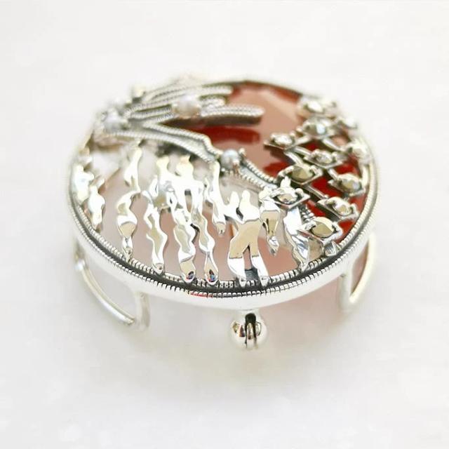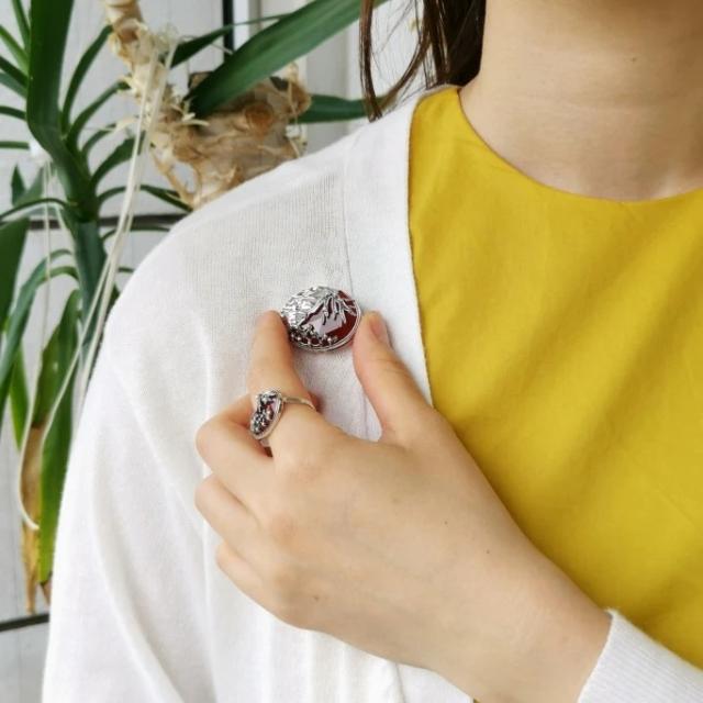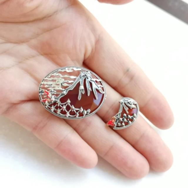 富士の山頂や裾野部分にシードパールやマルカジットを合わせて、より赤メノウが引き立ち美しい作品となりました。