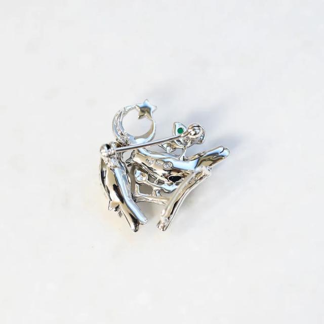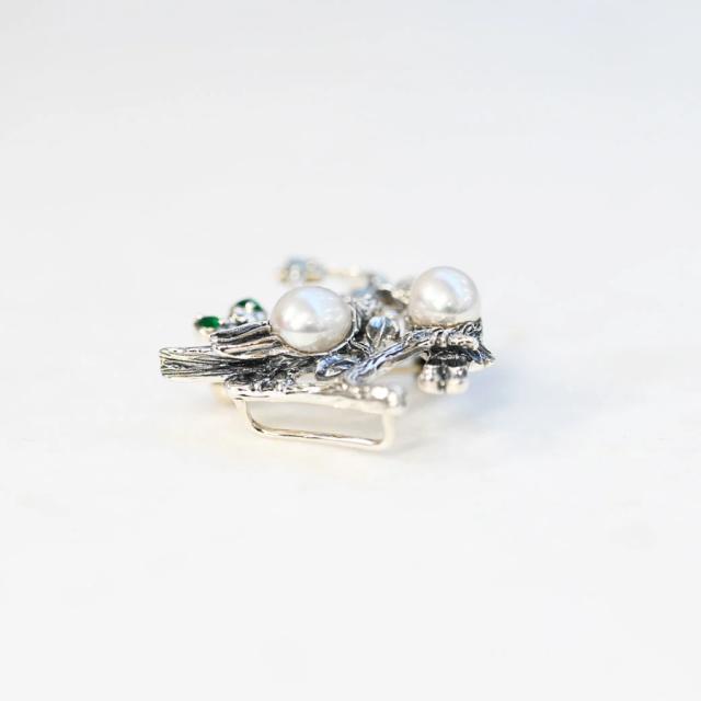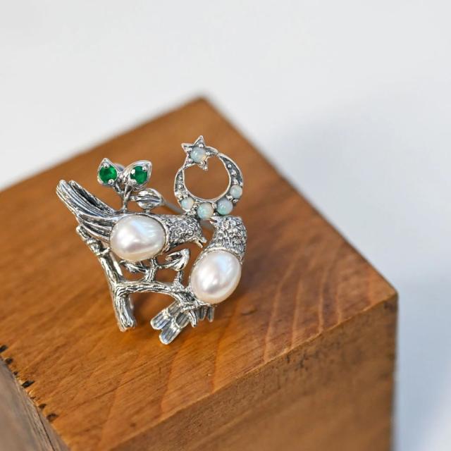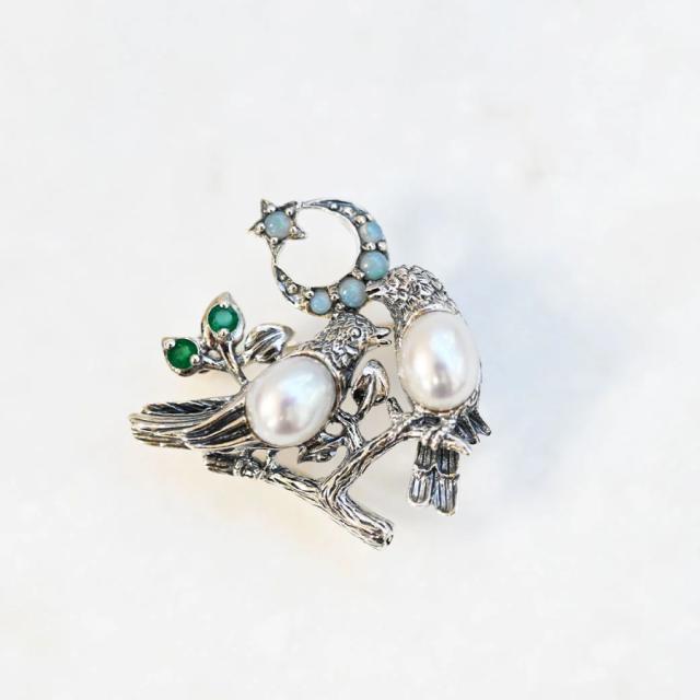 小ぶりなサイズながらも、細部まで丁寧に作り込まれたデザインは、まるで月夜に集う二羽の鳥たちの静かな語らいシーンを切り取ったかのよう。控えめな中にも品格と物語性を持ち合わせており、装いにそっと詩的な彩りを添えてくれる一品です。