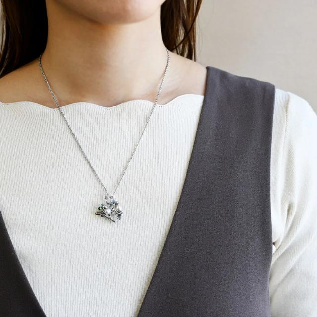 柔らかな輝きを放つパールが鳥の体にあしらわれ、月夜に照らされた輝く羽を表現。遊色効果が楽しめるオパールが三日月にセットされ、幻想的な世界を思わせる印象です。さらに葉っぱの部分には深い緑色のエメラルドが添えられ、自然の息吹と生命力を感じさせるアクセントになっています。