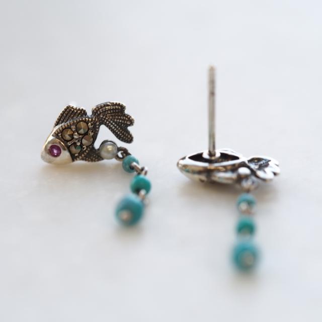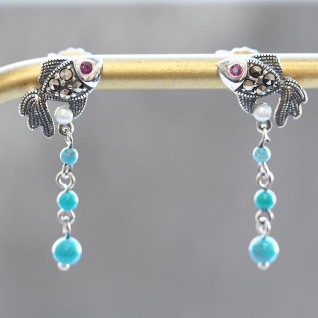金魚をモチーフとしたピアスです。目にルビー、体にマーカサイトが留められ、下に泡のようなシードパールとターコイズの玉が連なり揺れる和風のデザインです。