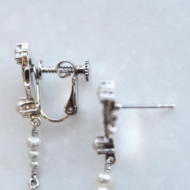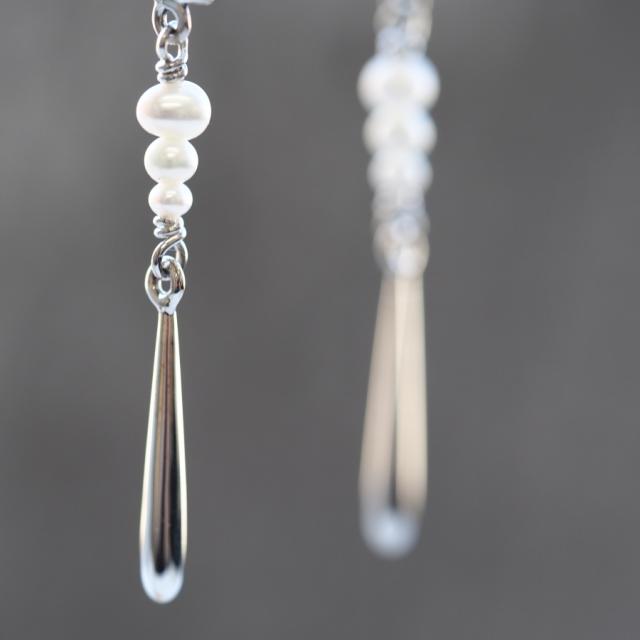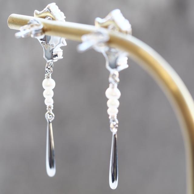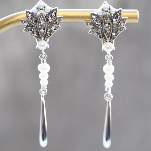 縦長にシュッとして優雅に揺れるシードパールとマーカサイトのピアス/イヤリングです。