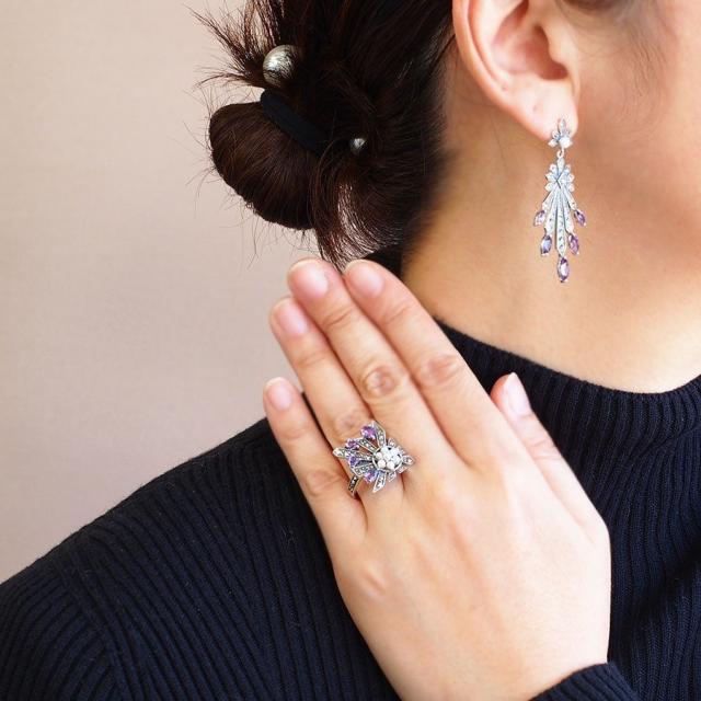 下部についているモチーフはチャームのように揺れる仕様で動作に合わせて見える表情が変わりお顔周りを華やかに彩ります。