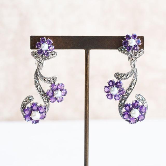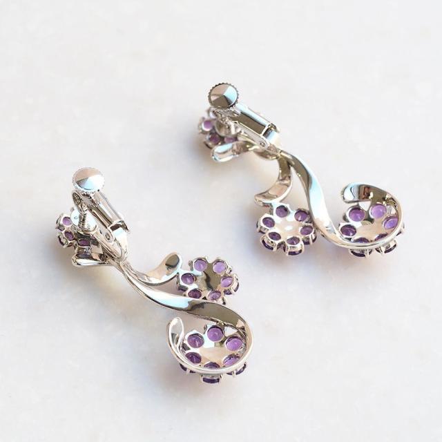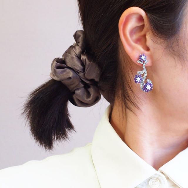 アメシストの可愛らしい大・中・小のサイズ違いのお花が3輪咲いているイヤリングです。