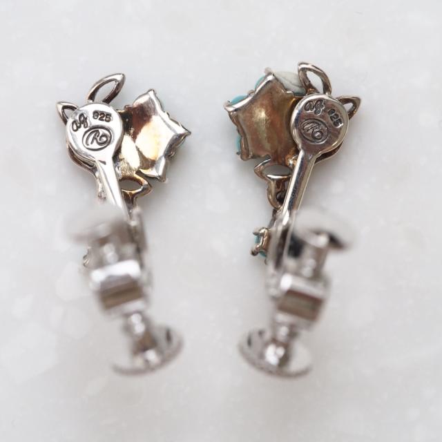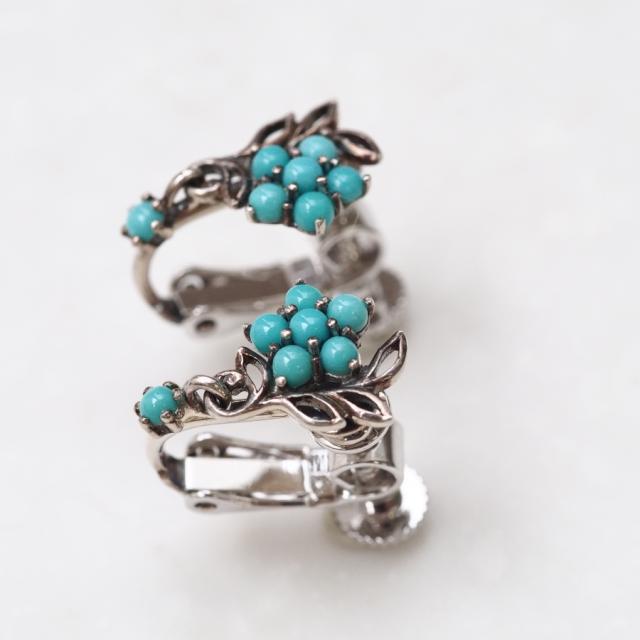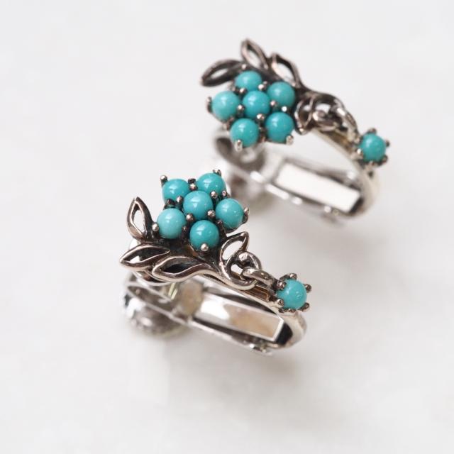 花のモチーフにしなやかな葉を沿え、さらにその下にターコイズが一粒揺れる可憐なデザインです。主張しすぎずエレガントに装うことができる一品です。