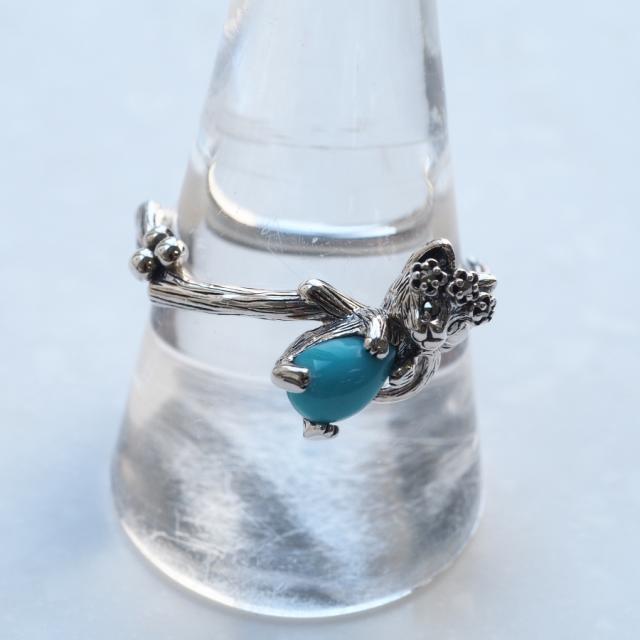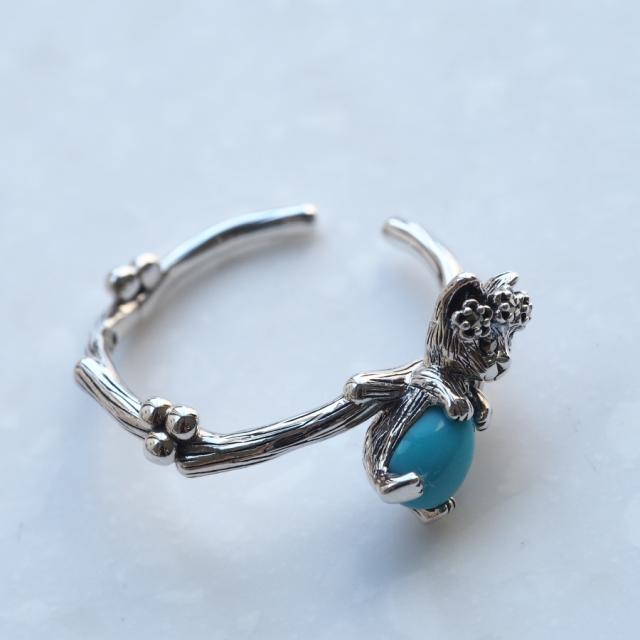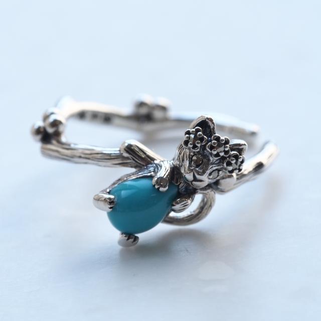 子猫がターコイズを大事そうに抱えている様子が可愛いフリーサイズリング。
