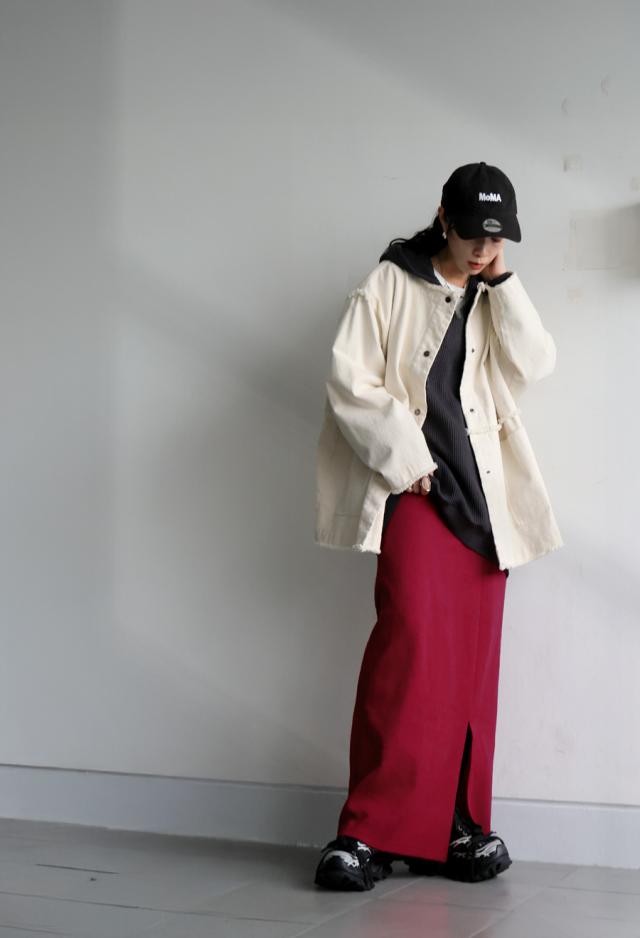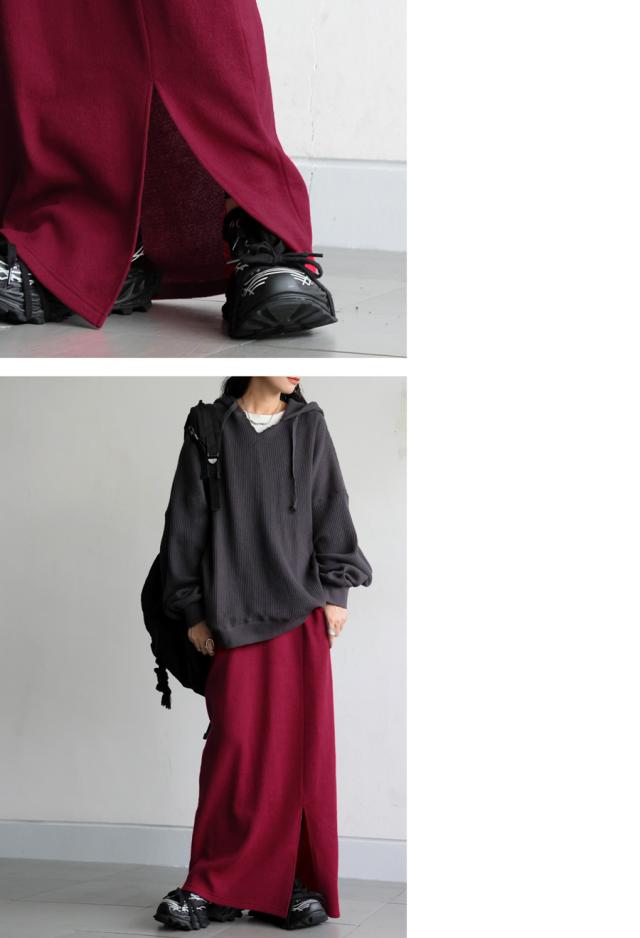 丈感は足首にかかる長さで、無地の柄とフロントスリットが抜け感を演出します。