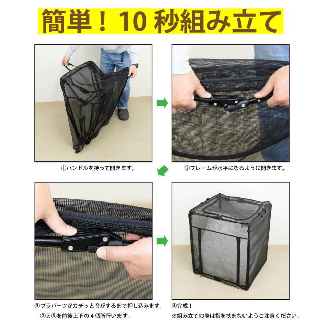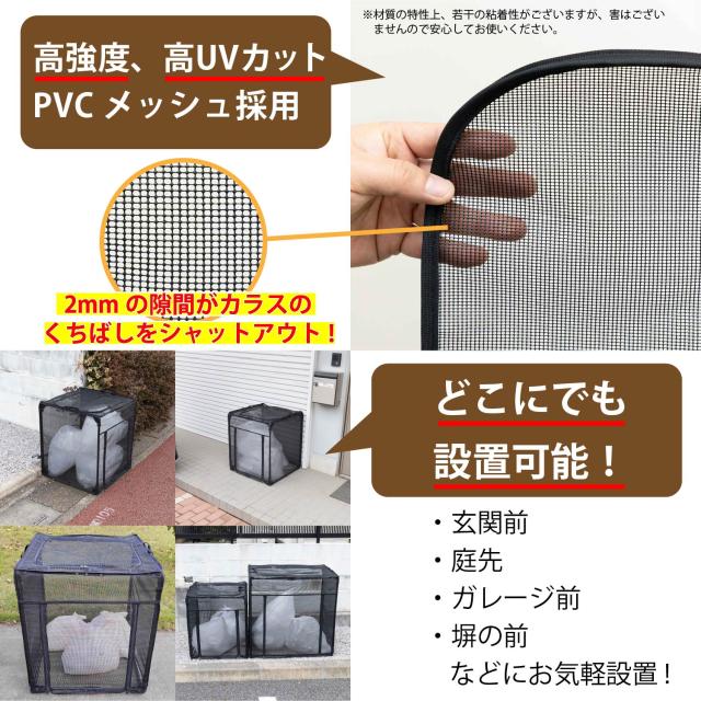 組み立てて置くだけの簡単設置のゴミボックスは、カラスや小動物にゴミが荒らされることを防ぎます。ネットの網目はわずか2mmなのでカラスのクチバシも通りません。