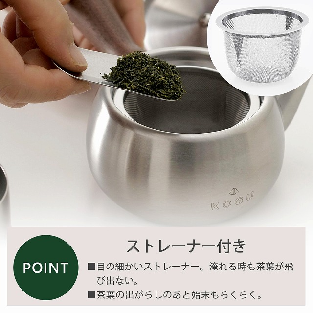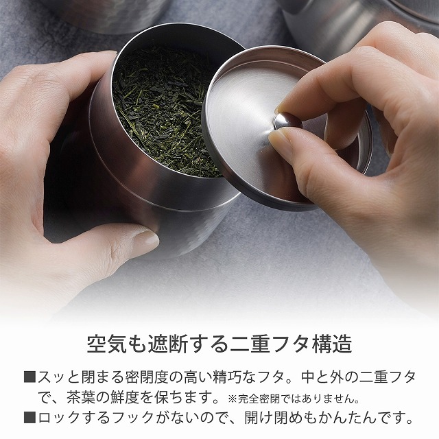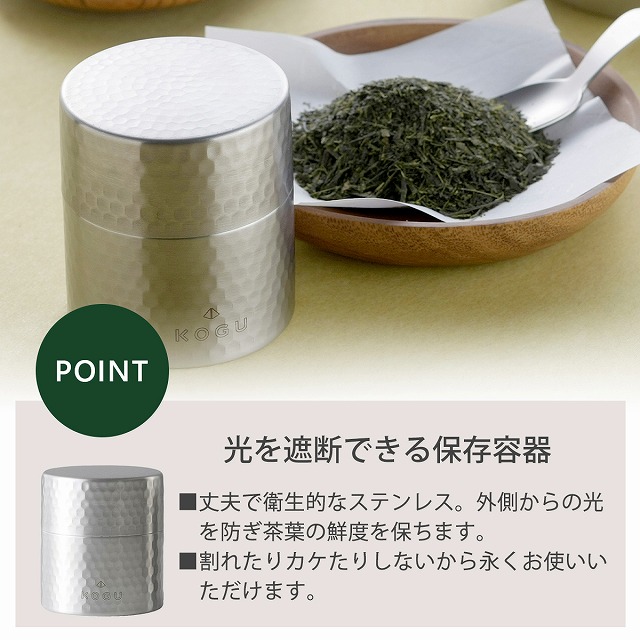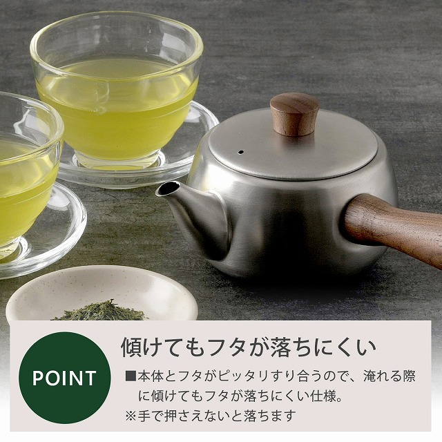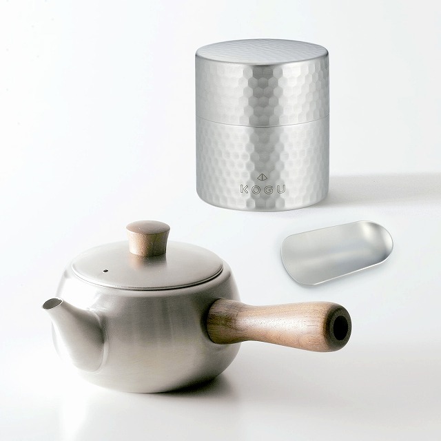 「ギフトセット」淹れやすい横手ハンドルのステンレス急須。1〜2人分が淹れられるサイズ。ハンドル、ツマミは熱くならない木製。光を遮断して鮮度を保つ内蓋付きの茶筒。茶筒の内蓋の上にのせられるサイズの茶み。