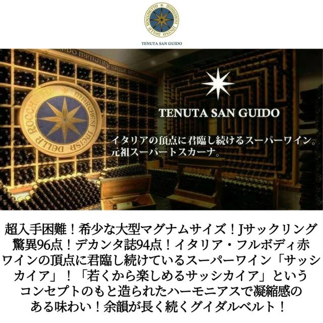 超入手困難!希少な大型マグナムサイズ!Jサックリング驚異96点!デカンタ誌94点! イタリア・フルボディ赤ワインの頂点に君臨し 続けている スーパーワイン「サッシカイア」! 「若くから楽しめるサッシカイア」というコンセプトのもと造られたハーモニアスで凝縮感の ある味わい!余韻が長く続くグイダルベルト!