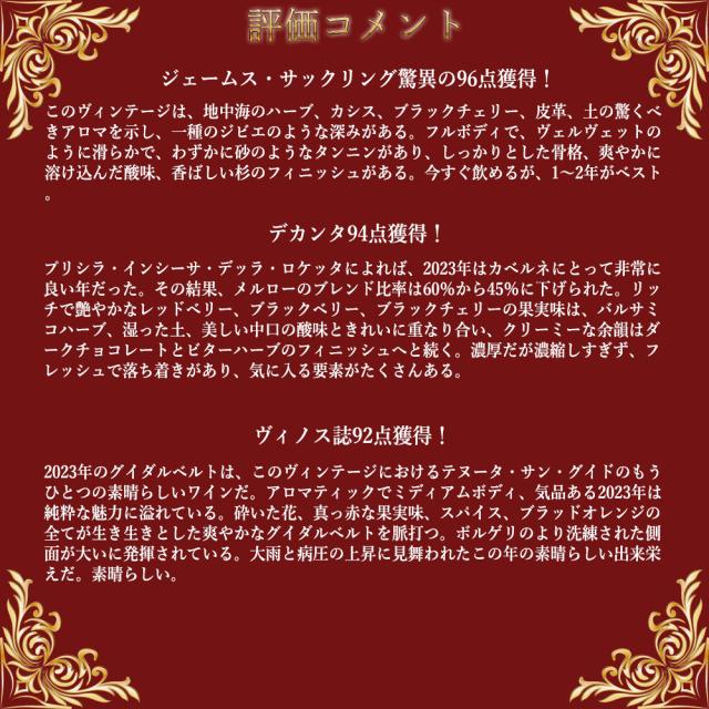 【大型マグナム 木箱】グイダルベルト (サッシカイア) 2023 テヌータ サン グイド IGT トスカーナ 正規代理店輸入品 JS驚異の96点