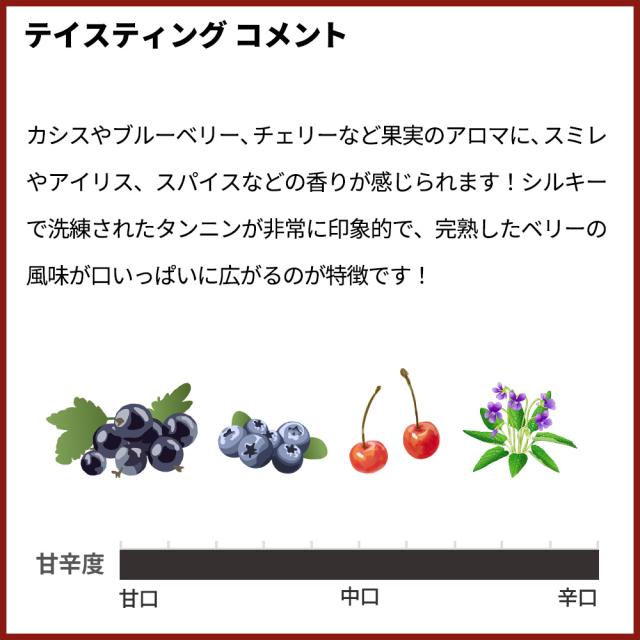 非常に濃い紫色の外観!カシスやブルーベリー、チェリーなど果実のアロマに、スミレやアイリス、スパイスなどの香りが感じられます!シルキーで洗練されたタンニンが非常に印象的で、完熟したベリーの風味が口いっぱいに広がるのが特徴です!フレッシュな酸がリッチな味わいとのバランスを保ちながら、余韻へと誘います!余韻には果実に加えて、カカオや土のニュアンスも感じられる仕上がりの究極フルボディ辛口赤ワイン!
