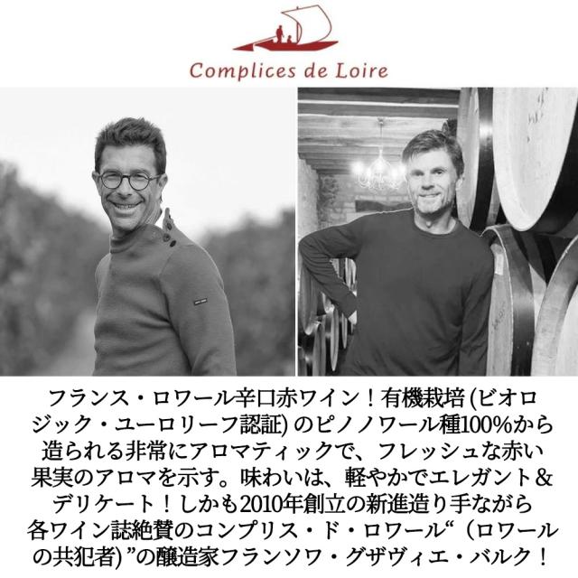フランス・ロワール辛口赤ワイン!有機栽培 (ビオロジック・ユーロリーフ認証) のピノノワール種100%から造られる非常にアロマティックで、フレッシュな赤い果実のアロマを示す。味わいは、 軽やかでエレガント&デリケート!しかも2010年創立の新進造り手ながら各ワイン誌絶賛のコンプリス・ド・ロワール“(ロワールの共犯者) ”の醸造家フランソワ・グザヴィエ・バルク!