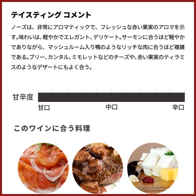 ![]() ■ぶどう品種:ピノノワール種100% ■平均樹齢:20年 ■葡萄畑面積:2.23ha ロワールおよびリムーの畑からの主に粘土質土壌のいくつかの区画から造られたVDF規格の究極赤ワイン! メゾンからの絶賛コメントは『このワインは、主に粘土質土壌のいくつかの区画から造られている。このような土壌は、温帯気候の影)と相まって、軽やかなピノ・ノワールと爽やかな酸味を持つ上質なワインに適している。平均樹齢は20年。ブドウは丁寧に除梗され、選果される数日間のマセラシオンの後、発酵が自然に始まる。タンクで最低10日間熟成させた後、ブドウは、圧搾され、マロラクティック発酵が行われる。ワインはステンレスタンクで数ヶ月間熟成され、瓶詰めされる。 ワインは紫がかった深みのある赤色、ノーズは、非常にアロマティックで、フレッシュな赤い果実のアロマを示す。味わいは、軽やかでエレガント、デリケート。』と絶賛コメント! |