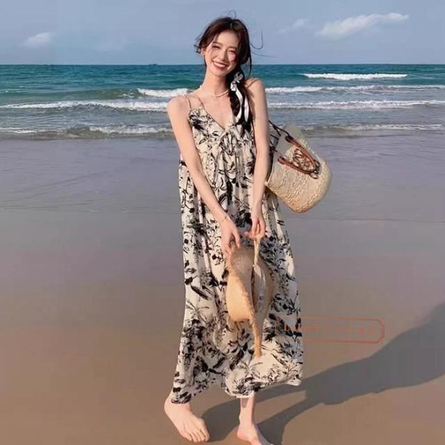 マキシ丈ワンピース キャミソール ロングワンピース レディース リゾート ハワイ 花柄 ビーチ リゾート ハワイ ボヘミアカジュアル 旅行