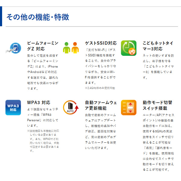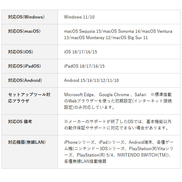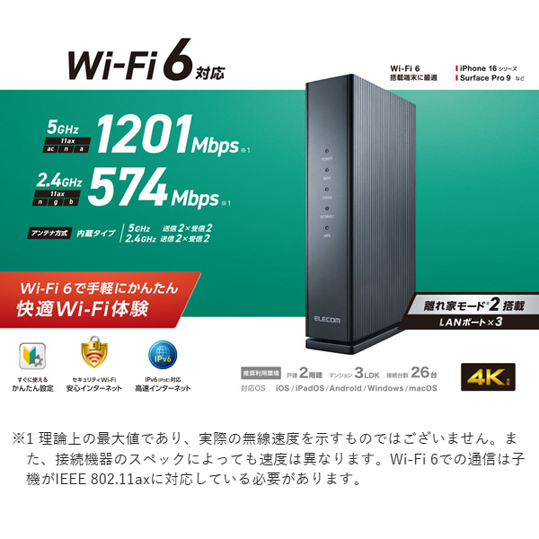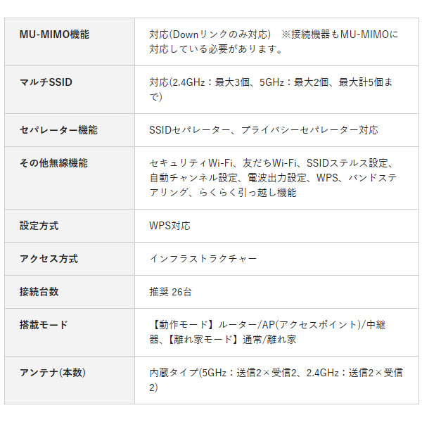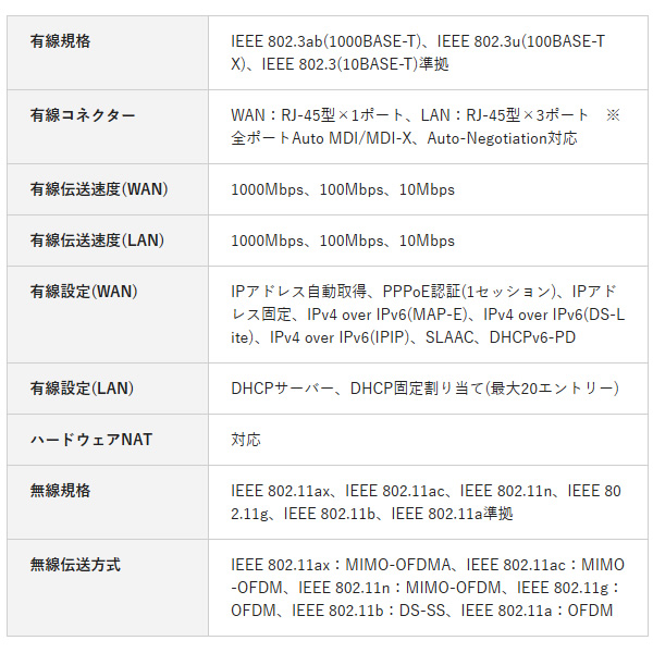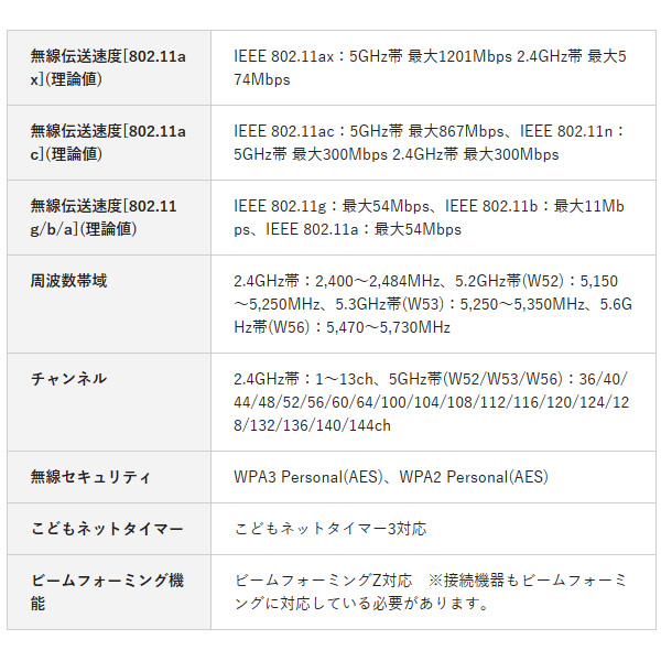 ■無線規格:IEEE 802.11ax、IEEE 802.11ac、IEEE 802.11n、IEEE 802.11g、IEEE 802.11b、IEEE 802.11a準拠