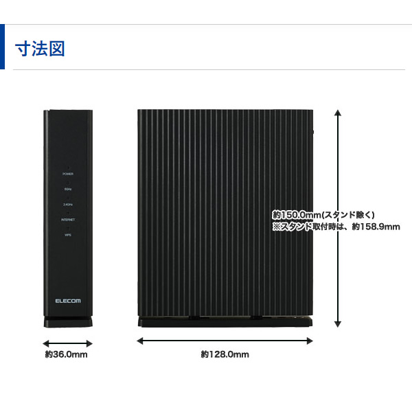 ■有線規格:IEEE 802.3ab(1000BASE-T)、IEEE 802.3u(100BASE-TX)、IEEE 802.3(10BASE-T)準拠 ■無線規格:IEEE 802.11ax、IEEE 802.11ac、IEEE 802.11n、IEEE 802.11g、IEEE 802.11b、IEEE 802.11a準拠 ■周波数帯域:2.4GHz帯:2,400〜2,484MHz、5.2GHz帯(W52):5,150〜5,250MHz、5.3GHz帯(W53):5,250〜5,350MHz、5.6GHz帯(W56):5,470〜5,730MHz ■入力電圧:AC100V±10% 50/60Hz ■消費電力:12.5W(最大) ■電源コネクター:DCジャック ■外形寸法:幅約36.0mm×奥行約128.0mm×高さ約150.0mm ※突起部、スタンド部除く ■質量:約400g(本体のみ) ■筐体材質(カラー):プラスチック(ブラック) ■動作環境:温度:0℃〜40℃、湿度:10%〜85%(ただし結露なきこと) ■各種取得規格:VCCI Class B、TELEC、JATE、PSE ■保証期間:1年間 ■付属品:ルーター本体1台、スタンド1個、専用ACアダプター1個、LANケーブル(約1m)1本、かんたんセットアップシート(初期値)1枚、マニュアル1枚 ※記載は商品仕様の一部です。仕様説明不足等の理由での返品はできません。特に適合等は必ずご確認ください。