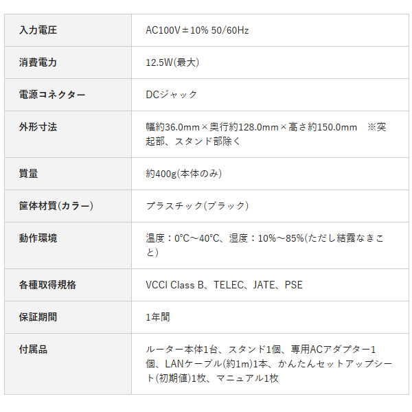 ■付属品:ルーター本体1台、スタンド1個、専用ACアダプター1個、LANケーブル(約1m)1本、かんたんセットアップシート(初期値)1枚、マニュアル1枚