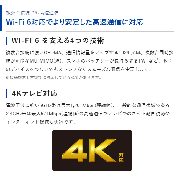 Wi-Fi 6対応で複数台同時接続時しても、より安定した高速通信を実現。