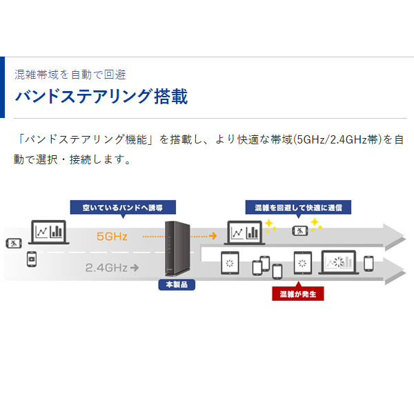 電波干渉に強い5GHz帯は最大1,201Mbps(理論値)、一般的な通信帯域である2.4GHz帯は最大574Mbps(理論値)の高速通信でテレビでのネット動画視聴やインターネット視聴も快適です。