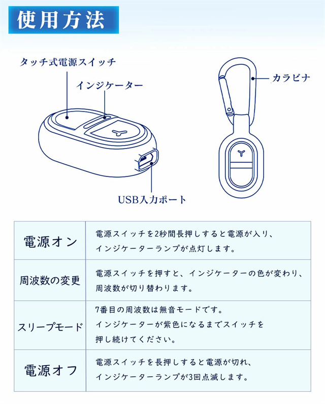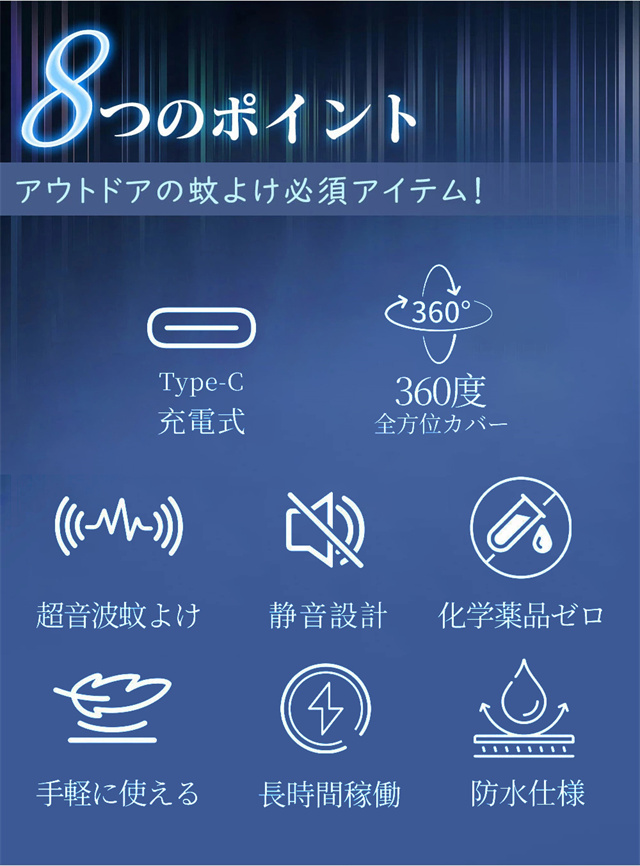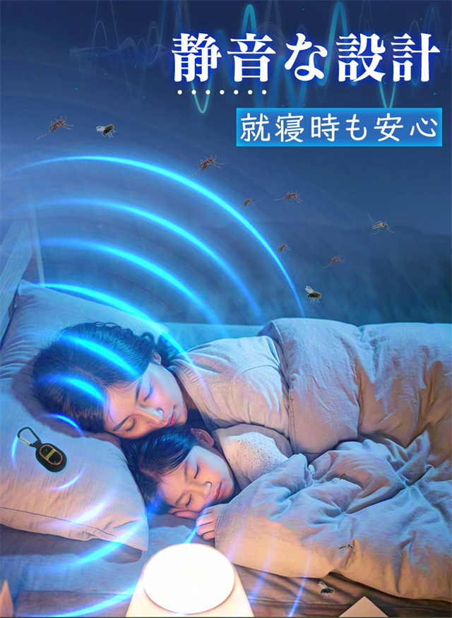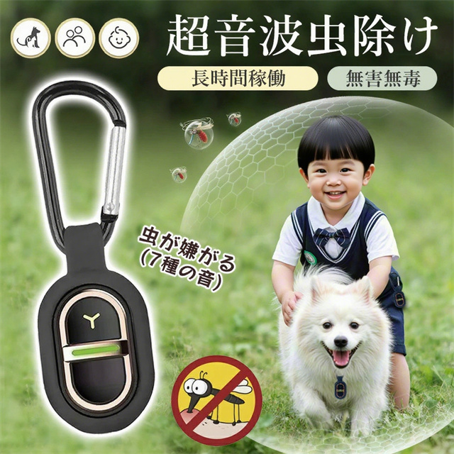 薬剤不要!音で蚊を寄せつけない 人体に無害な超音波を発生させて蚊を遠ざける、安心&安全の蚊よけグッズです。薬剤・火・煙は一切使わないので、小さなお子様やペットのいるご家庭にもおすすめ! USB充電式で繰り返し使える! 乾電池不要!USB充電タイプなので、モバイルバッテリーやPCから手軽に充電OK。一度の充電で長時間使用できて、経済的&エコロジー◎ 防雨設計で屋外でも大活躍! 防雨対応ボディで、急な雨や湿気の多い場所でも使用可能。ベランダやキャンプ、通勤・通学のリュックなどにも安心して使えます。 わずか15g!超軽量で持ち運びラクラク 本体はわずか15gの超軽量設計。バッグやポケットに入れても邪魔にならず、毎日持ち歩けるコンパクトサイズです。 カラビナ付きでどこでも装着OK 便利なカラビナ付きだから、バッグ・ベビーカー・テント・腰ベルトなどに簡単取り付け可能!アウトドアやお出かけに大活躍です。 静音&ライトなしで快適な夜を 動作音はほぼ無音!LEDライトも不使用なので、睡眠中でも気にならず、赤ちゃんのそばでも安心して使えます。 家族みんなに安心の蚊対策 お子様・大人・高齢者・ペットにも対応。どんな世代にも優しい、ノンケミカル&繰り返し使える蚊よけ対策グッズです。 |