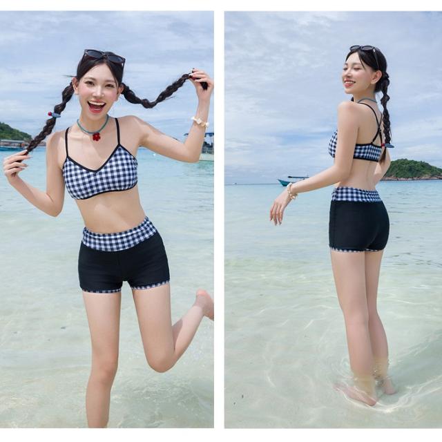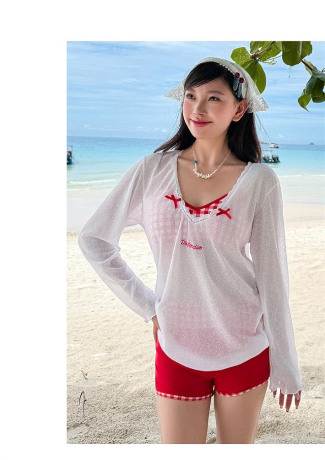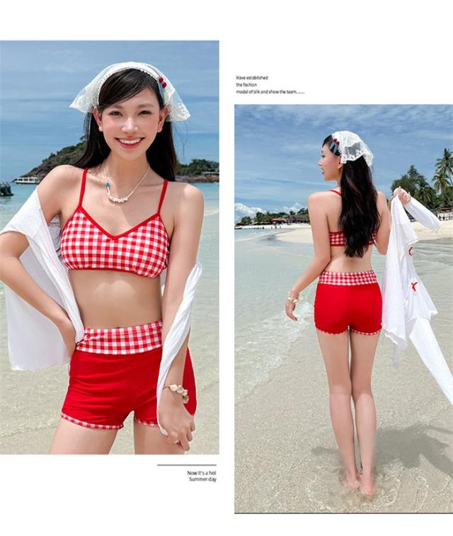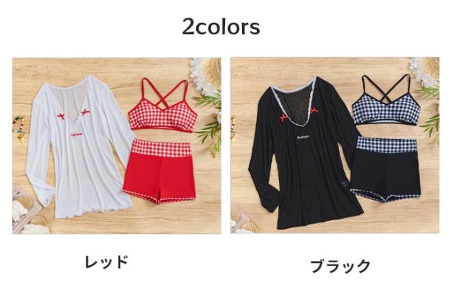 水着 レディース チェック柄 ビキニ タンキニ 大きいサイズ 3L 4L 5L 6L ぽっちゃり 20代 30代 3点セット 体型カバー水着 長袖 トップス ブラック レッド ノンワイヤー セパレート 大人 可愛い 二の腕 お尻 太もも セクシー カバーアップ 羽織り