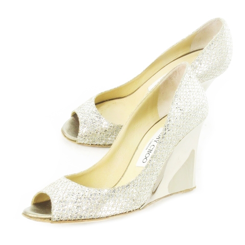 【中古】ジミーチュウ JIMMY CHOO パンプス オープントゥ ウェッジソール メタルプレート ラメ 36.5 シルバーカラー