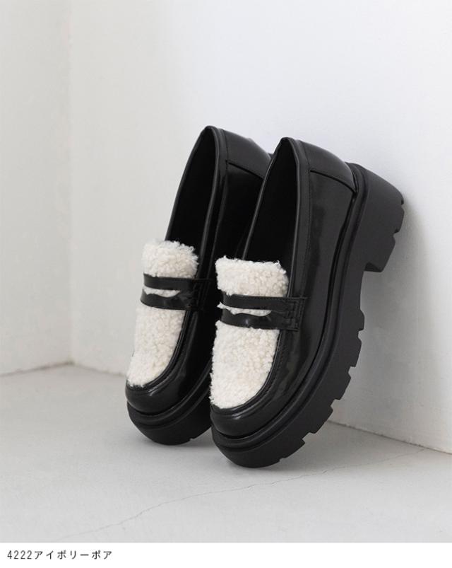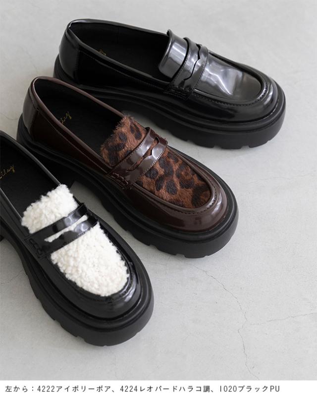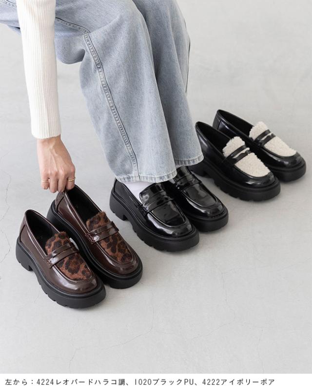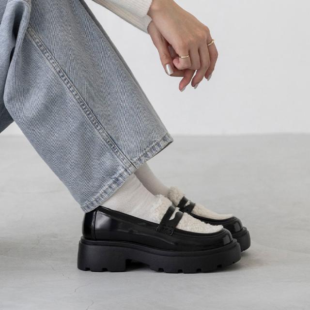 定番のコインローファーに、暖かなボア素材や旬のレオパード柄をあしらい、足元からトレンド感を演出。