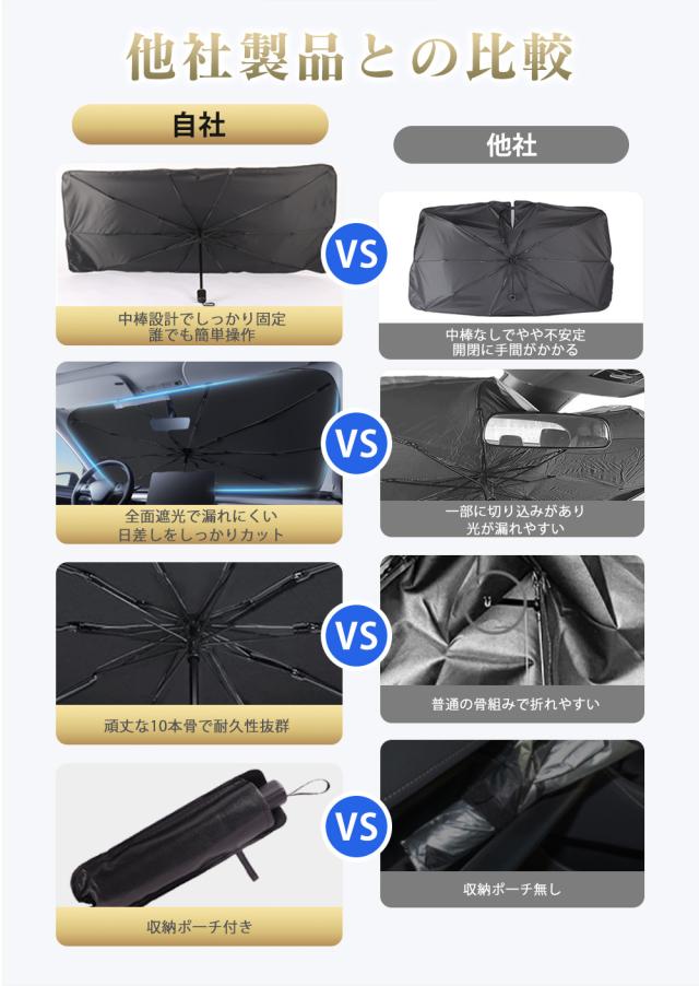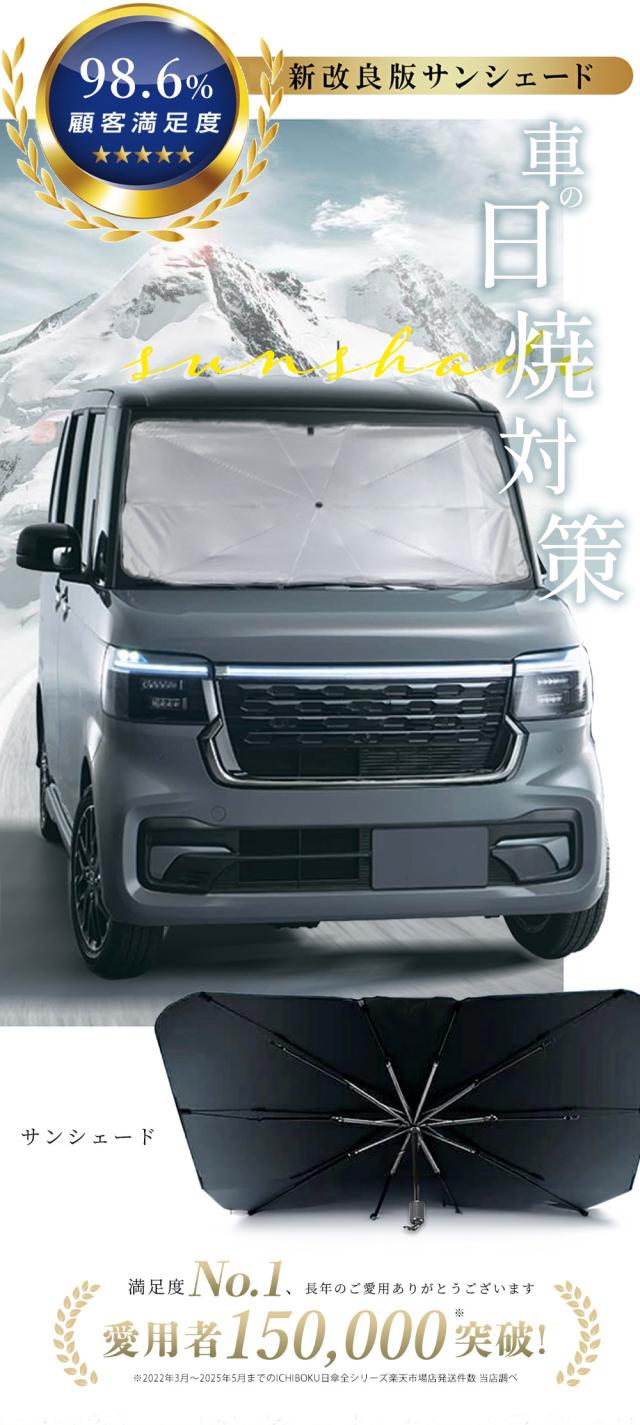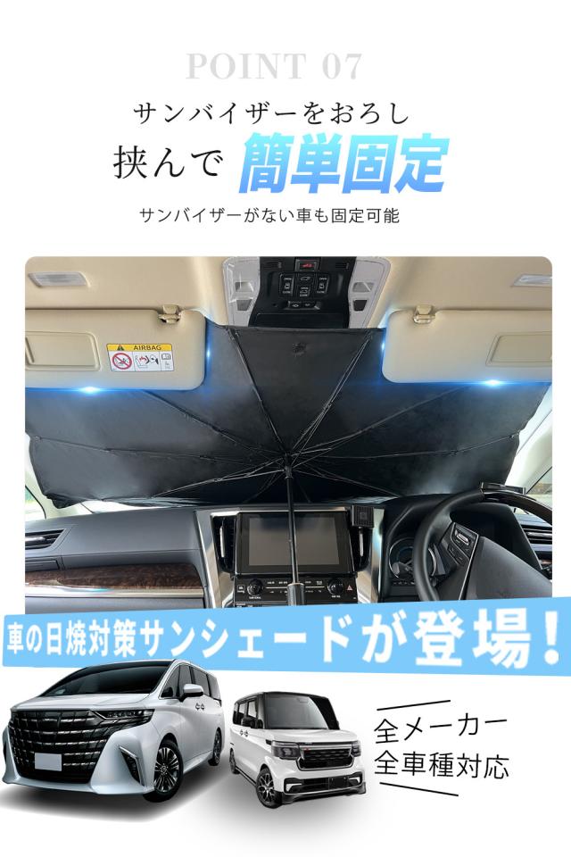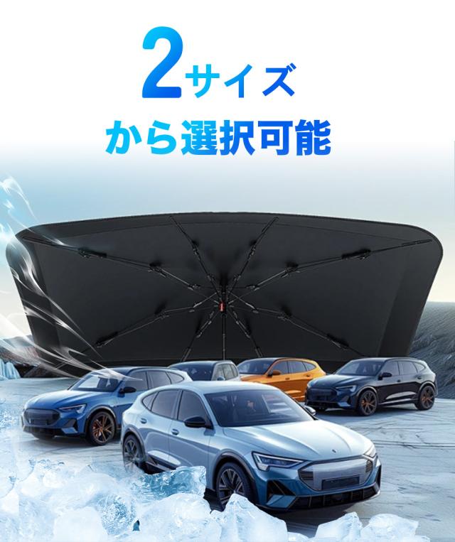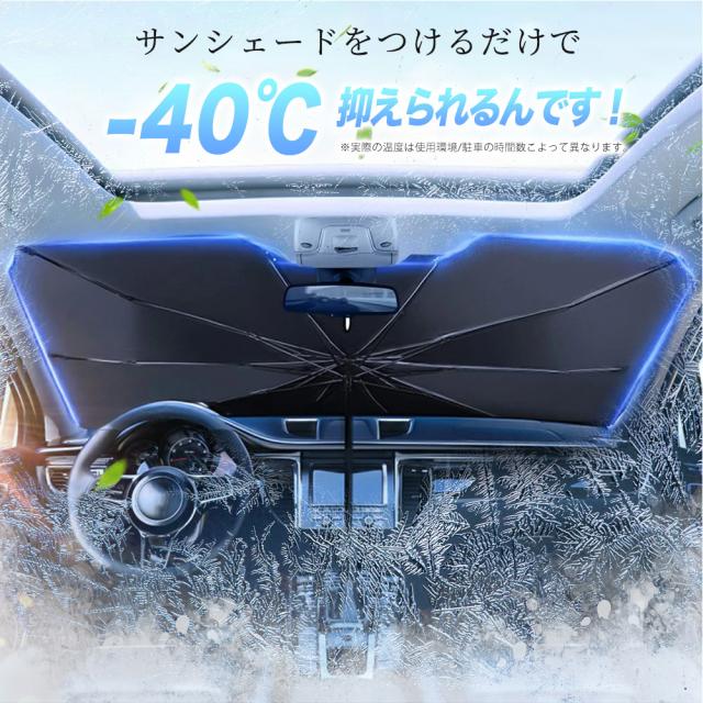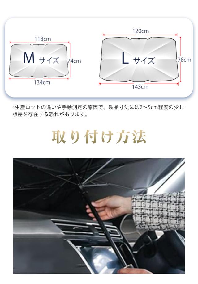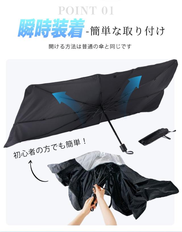 【車用サンシェード 傘型 折りたた式】2025年改良版の車用傘型サンシェードが登場しました。このサンシェードは、従来の吸盤タイプよりも取り付けが簡単で、傘のように広げてフロントウインドウにセットするだけで完了します。一人で取り付けられるので、力の弱い方でも問題ありません。使用しないときは、数秒でコンパクトに収納可能です。