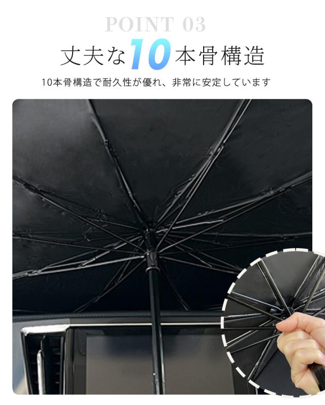 【耐久性があるフロントサンシェード】この傘型サンシェードは、細部まで丁寧に設計されています。ハンドルは滑りにくく、しっかりと握れるデザインです。骨組みは特殊な保護カバーで覆われており、開いた状態でも外部の影響から保護されます。10本の繊維複合材質の骨組みは、安定性と耐久性を提供し、折れにくくなっています。また、複合チタン銀接着剤を使用することで、接着部分の耐久性が向上し、長期間使用しても安心です。