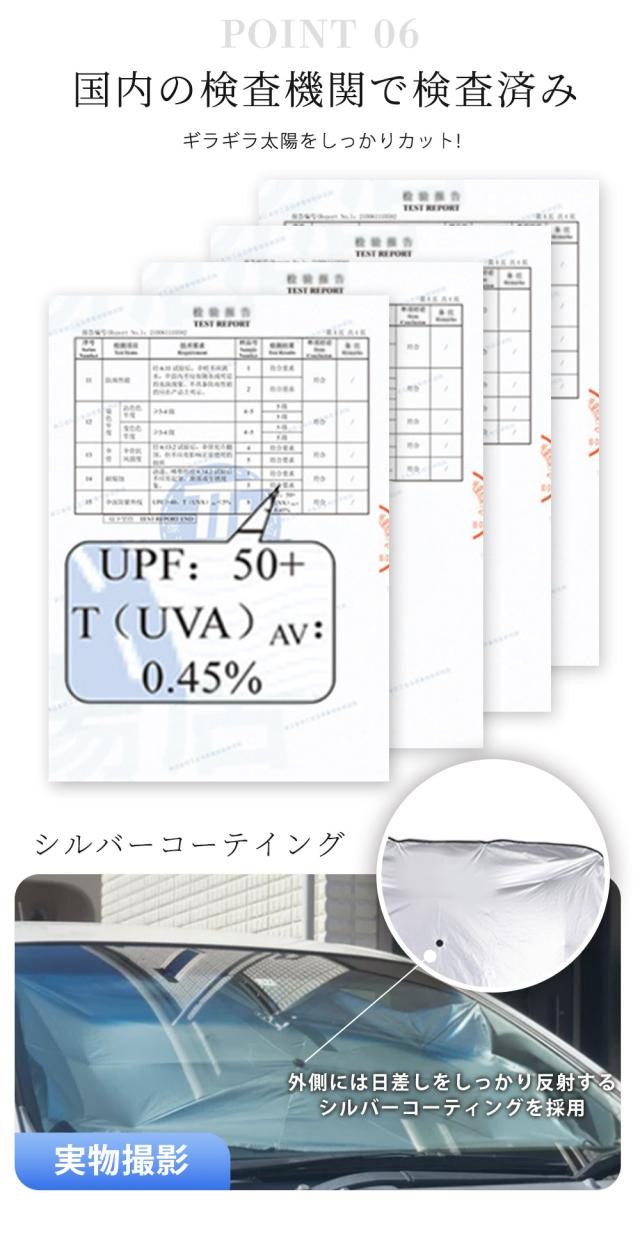 【6層高分子断熱材料・内装劣化防止】 傘面は6層ナノ高分子断熱材料を採用し、外側はチタンシルバーコーティングで、強い日差しを反射して車内温度の上昇を抑え、