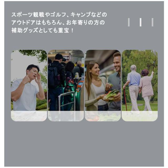 | ステッキにも椅子にもなる1台で2役のステッキチェアです。 ウォーキング中などに疲れたとき座面を下ろせば、場所を選ばず、すぐに座れて休憩ができます。 軽くて丈夫、持ち運びに便利です。 スポーツ観戦やゴルフ、キャンプなどのアウトドアはもちろん、お年寄りの方の補助グッズとしても重宝! | |