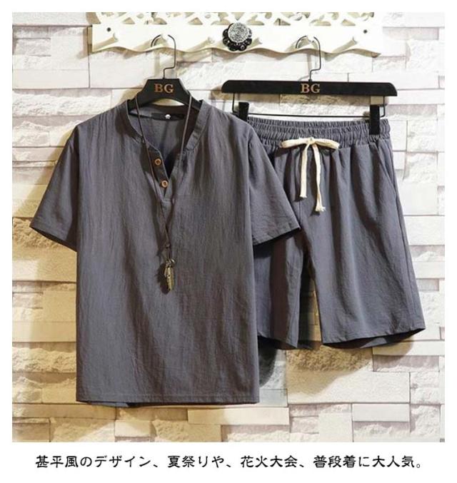 夏 リネンシャツ セットアップ ルームウェア ショートパンツ 綿麻 男性 部屋着 パジャマ Vネック キーネック 上下セット 甚平 涼しい じんべい ホームウエア 甚兵衛 半袖 寝巻き 夏用 送料無料 和風 メンズ