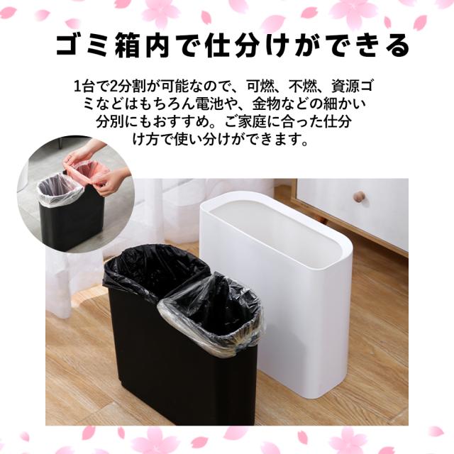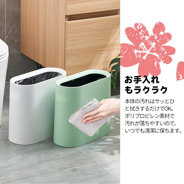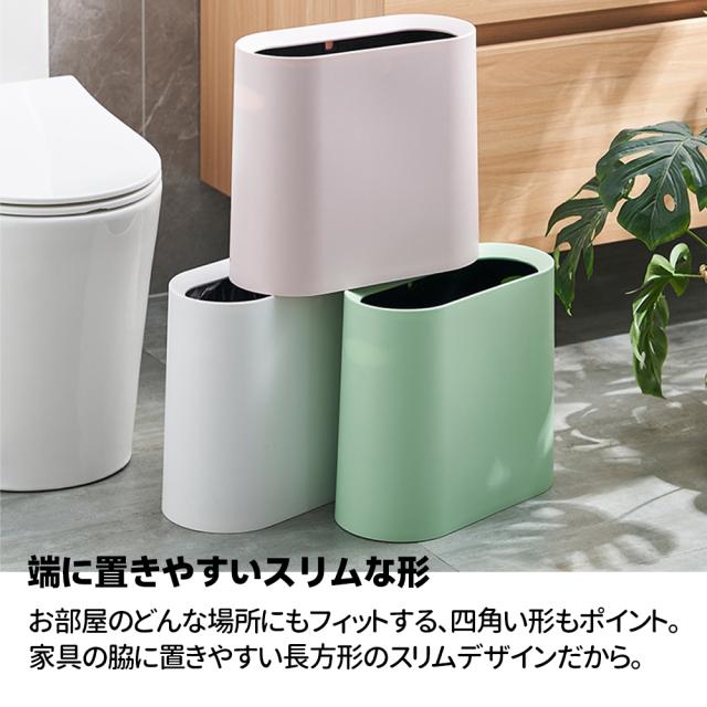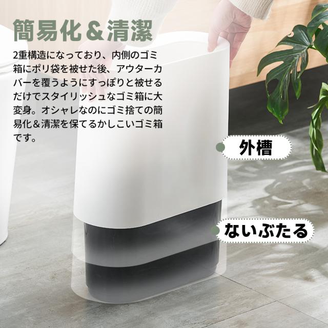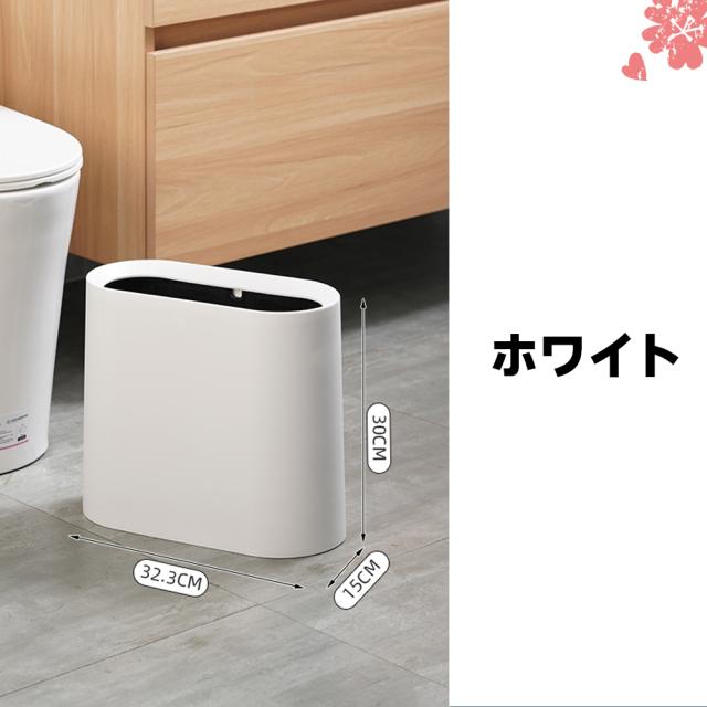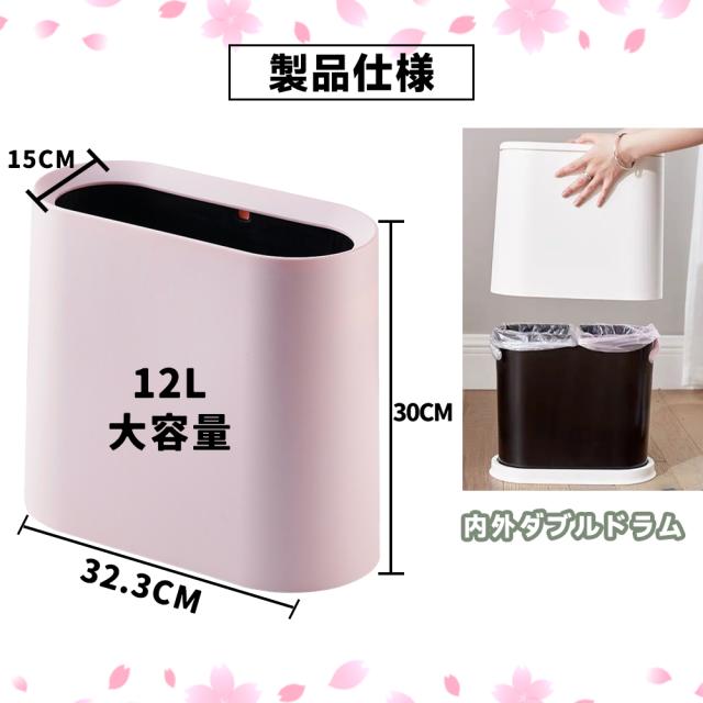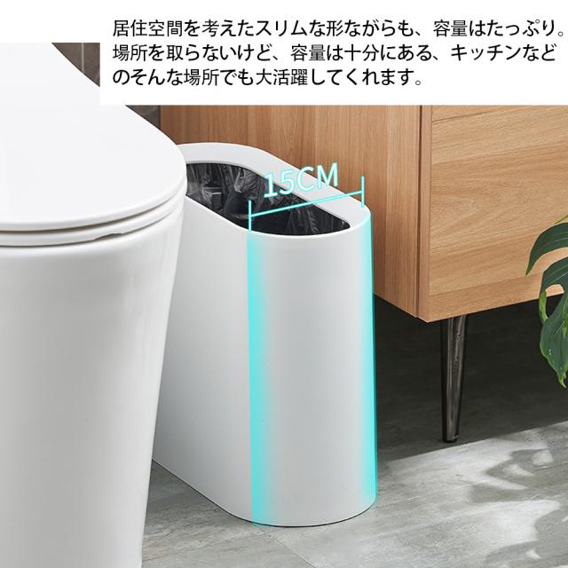 【コンパクトゴミ箱】 コンパクトな形でスペースをあまりとりません。 バスルーム、リビングルーム、 ベッドルーム、オフィス、子供部屋、 トイレ、キャンプ、 あらゆるシーンで大活躍! 【高品質の素材】 PP製ですので衝撃や熱に強く、耐摩耗性と損傷耐性があり、耐久性がよいです。内側のバケツはPPプラスチック製で、表面が滑らかで耐食性があり、お手入れ、お掃除も簡単です。 【ごみの分類】 二重密封ゴミ箱で、ゴミ袋をかける溝が2つあり、ゴミ袋2つをかける可能です。 ゴミの分類には便利です。 【スリム ゴミ箱】 高さ:30cm、 幅:15 cm、 長さ:32.3cm。 12Lの家庭用ゴミを簡単に収納できます。スリムなゴミ箱は、狭い廊下や狭いコーナー、家具の間などの狭い場所に最適で、さまざまな狭いスペースの合理的な使用。