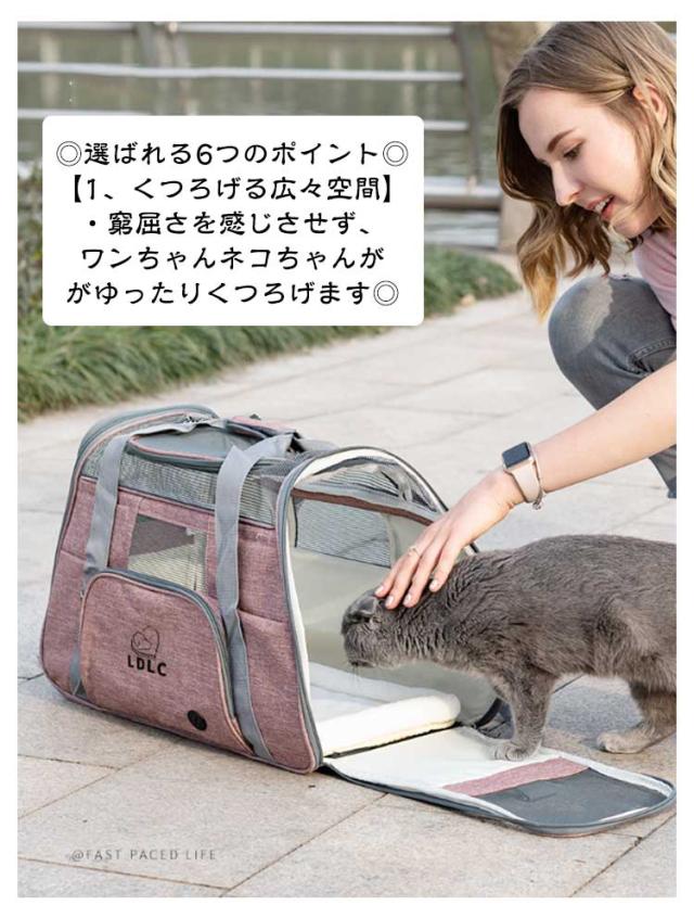 | ふかふかのマット付きで快適♪ 折り畳み式2WAYペットキャリーバッグ 3つのポケット付き ◎選ばれる6つのポイント◎ 【1、くつろげる広々空間】 ・窮屈さを感じさせず、ワンちゃんネコちゃんががゆったりくつろげます◎ ・サイズ:(約)幅51cm×奥行23cm×高さ35cm 丈夫でしっかり、安定感が抜群です◎ ・ふかふかのマット付きで、ワンちゃんネコちゃん快適♪ ・カバーは、外してお洗濯が可能。ずっと衛生的に使えます◎ ・飛び出し防止用リード付きで安心。 【2,出入りがスムーズ】 上部と左右、どの位置からも出入りが可能。 抱っこしたままでも、スムーズに入れられます。 ・キャリーバッグに入るのが苦手なワンちゃん、ネコちゃんにもおすすめ◎ 【3,通気性が抜群】 丈夫なメッシュ素材で、通気性が抜群。 暑い季節も、安心してお出掛けができます。 引っ掻き傷にも強い、丈夫な素材◎ ・3つの便利なポケット付きで、リードやおやつ、診察券などをサッと取り出せる◎ ・コード穴付きで、やイヤホンなどのコードも通せます◎ 【4,中の様子がわかりやすい】 前後左右から、いつでも中の様子をすぐに確認できる。 移動中も安心です◎ 【5,折り畳みが可能】 使わない時は、折り畳んでコンパクトに収納可能。 置き場所にも困りません。 【6,2WAYで移動がラクラク】 手持ち・ショルダーの2WAY仕様。 シーンに合わせた使い方ができます。 ・手が痛くなりにくい、丈夫な持ち手 ・肩への負担が少ない、ショルダーベルト 充実の機能性! ・車での移動も安心 →シートベルトに固定できる、車用バックルが付き。 ・旅行時にも大活躍 キャリーオンにできるベルト付き。 ◎◎こんなシーンにおすすめ◎◎ ・一緒のお出掛けに ・通院に ・ドライブに ・災害時の備えとして | |