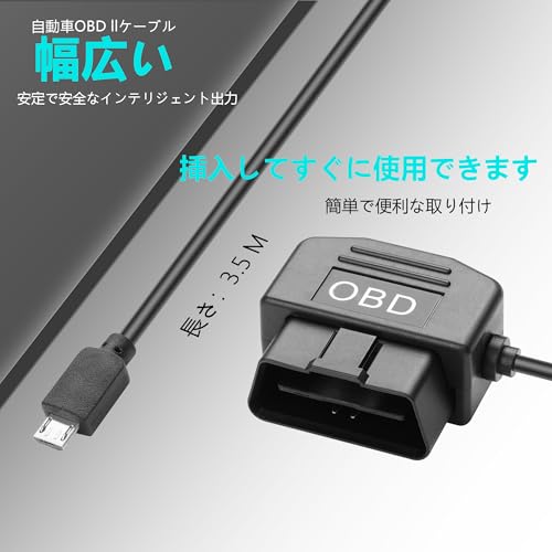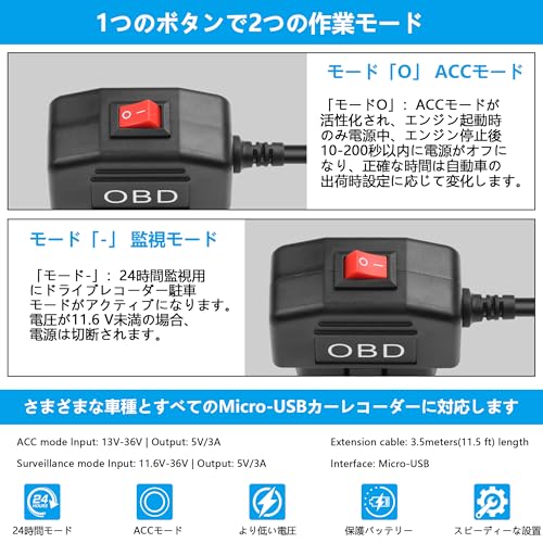 マイクロUSB OBD電源コード OBD Micro USB カーレコーダー 電源ケーブル 24時間監視/Accモード 12v/24vから5v OBDプルダウンケーブル ボタン付き 3.5M (Micro-USBタイプ)