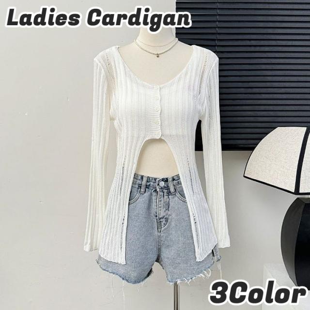 カーディガン サマーニット レディース 女性 女子 トップス 長袖 羽織り Uネック 前ボタン 薄手 透け感 ダメージ 通気性